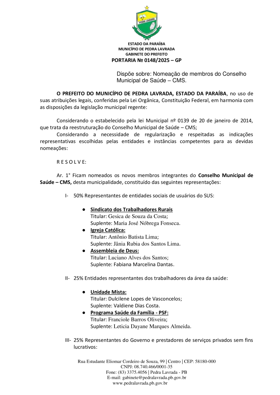 PORTARIA N° 0148/2025 - DISPÕE SOBRE NOMEAÇÃO DE MEMBROS DO CONSELHO MUNICIPAL DE SAÚDE – CMS