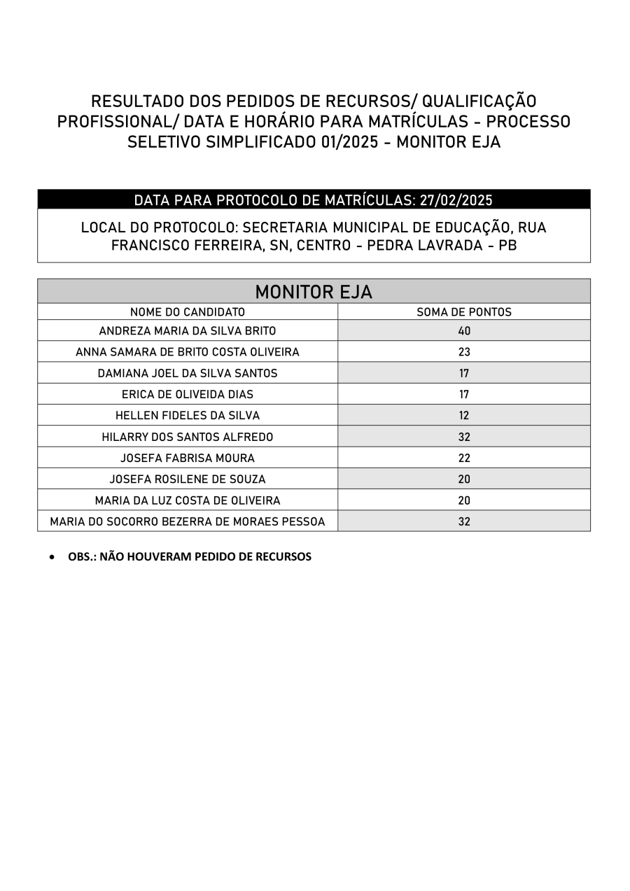 RESULTADO DOS PEDIDOS DE RECURSOS/QUALIFICAÇÃO PROFISSIONAL/ DATA E HORÁRIO PARA MATRÍCULAS - PROCESSO SELETIVO SIMPLIFICADO 01/2025 - MONITOR EJA