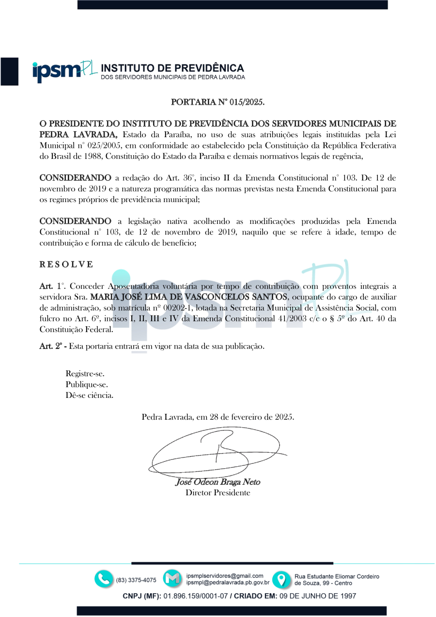 PORTARIA N° 0015/2025 - CONCEDER APOSENTADORIA VOLUNTÁRIA POR TEMPO DE CONTRIBUIÇÃO A SERVIDORA SRA. MARIA JOSÉ LIMA DE VASCONCELOS SANTOS