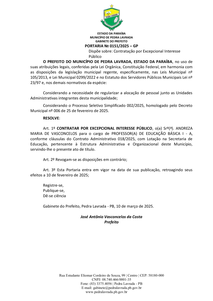 PORTARIA N° 0151/2025 - DISPÕE SOBRE CONTRATAÇÃO POR EXCEPCIONAL INTERESSE PÚBLICO