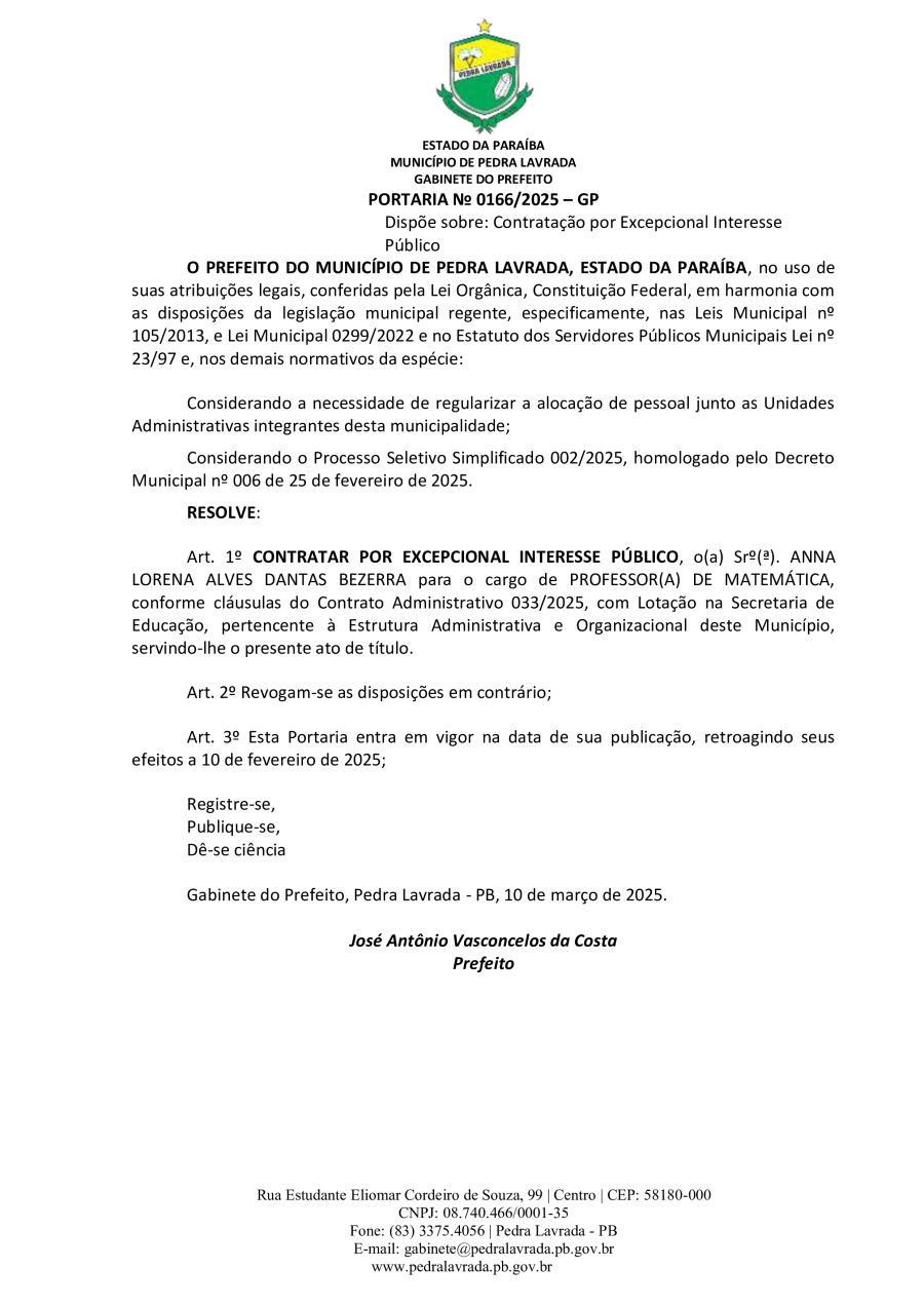 PORTARIA N° 0166/2025 – DISPÕE SOBRE CONTRATAÇÃO POR EXCEPCIONAL INTERESSE PÚBLICO