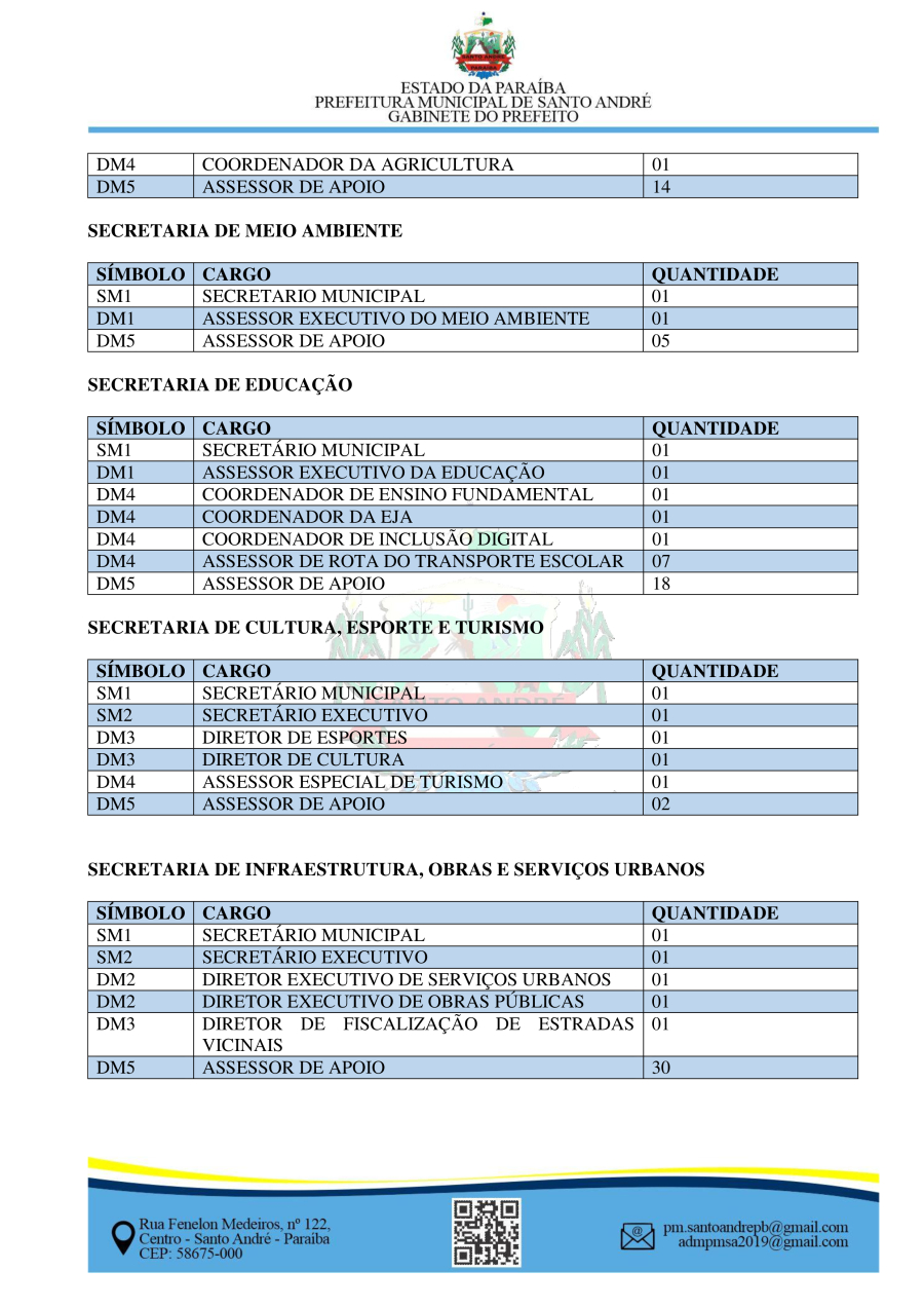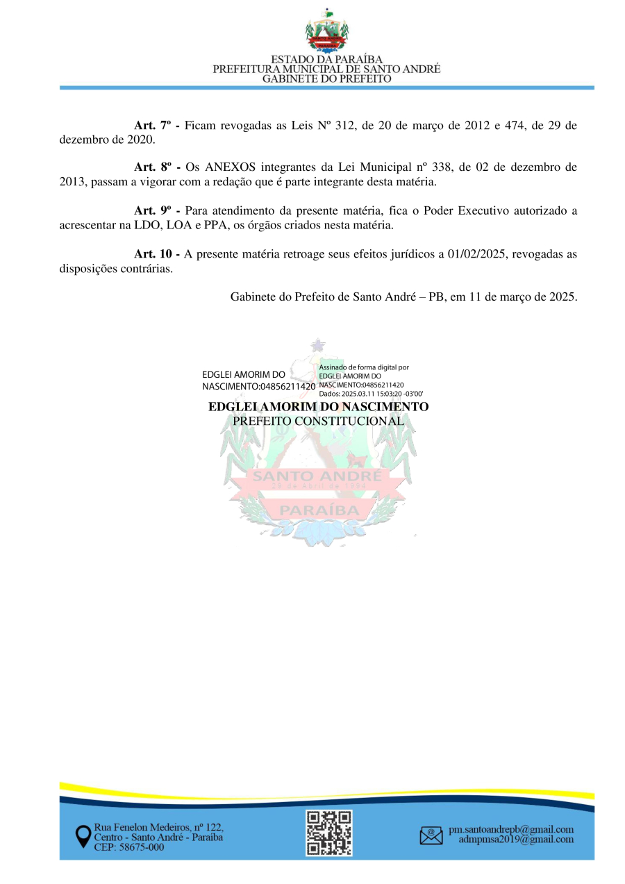 LEI Nº 600/2025 - ALTERA DISPOSITIVOS DAS LEIS MUNICIPAIS Nº 262/2010 E 338/2013 QUE TRATAM DA ESTRUTURA ORGANIZACIONAL DO MUNICÍPIO DE SANTO ANDRÉ-PB, E DÁ OUTRAS PROVIDÊNCIAS.