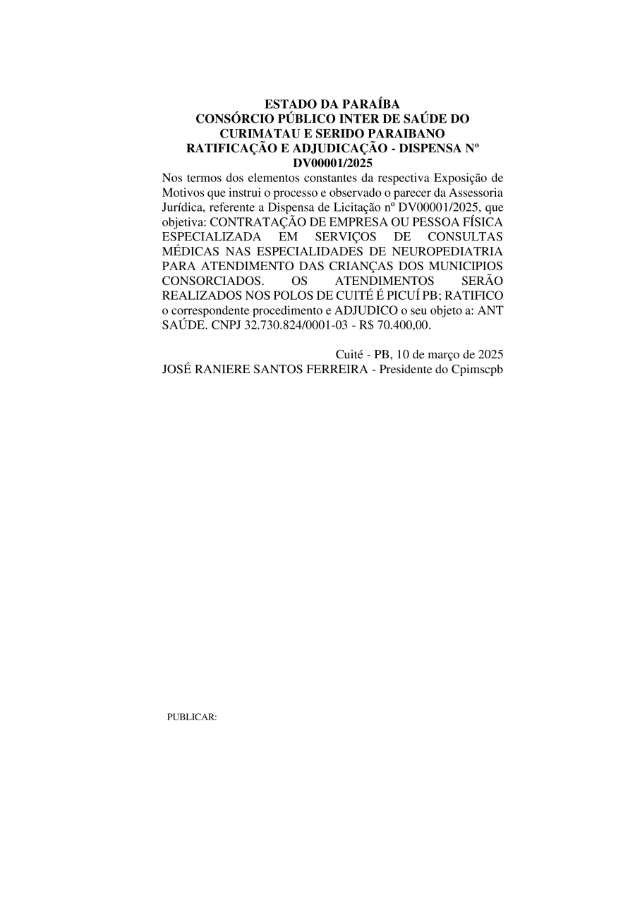Conforme MP n° 2.200-2 de 24/08/2001, que institui a infraestrutura de chaves Públicas. Matéria Publicada no Diário Oficial do Consórcio Intermunicipal de Saúde do Curimataú e Seridó Paraibano/PB no dia - Edição 01179.