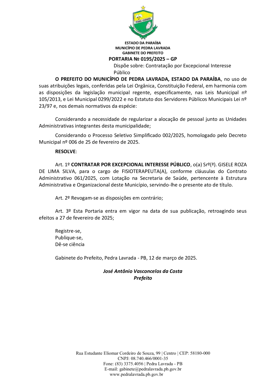 PORTARIA N° 0195/2025 - DISPÕE SOBRE CONTRATAÇÃO POR EXCEPCIONAL INTERESSE PÚBLICO