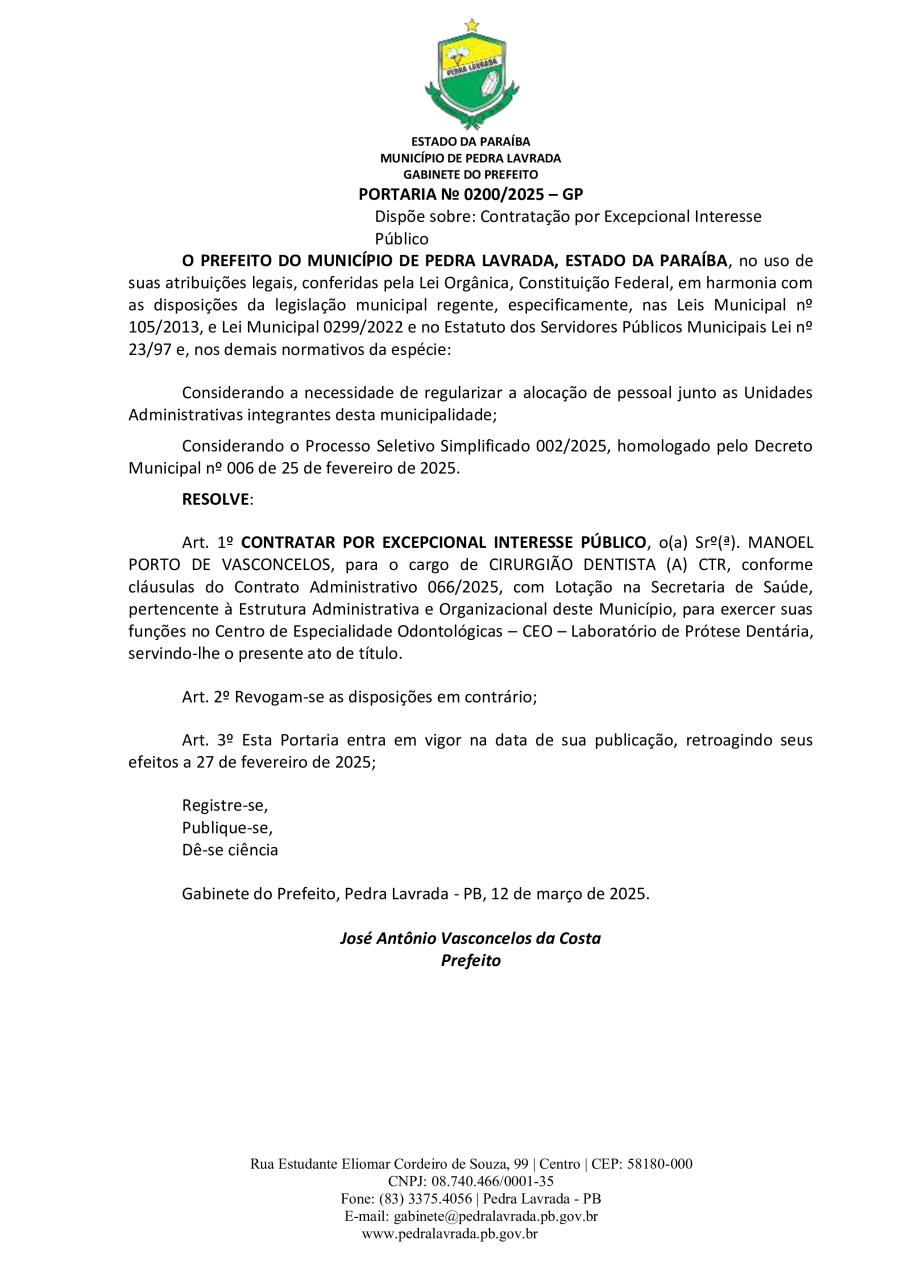 PORTARIA N° 0200/2025 - DISPÕE SOBRE CONTRATAÇÃO POR EXCEPCIONAL INTERESSE PÚBLICO