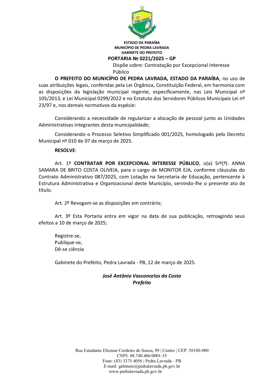 PORTARIA N° 0221/2025 - DISPÕE SOBRE CONTRATAÇÃO POR EXCEPCIONAL INTERESSE PÚBLICO