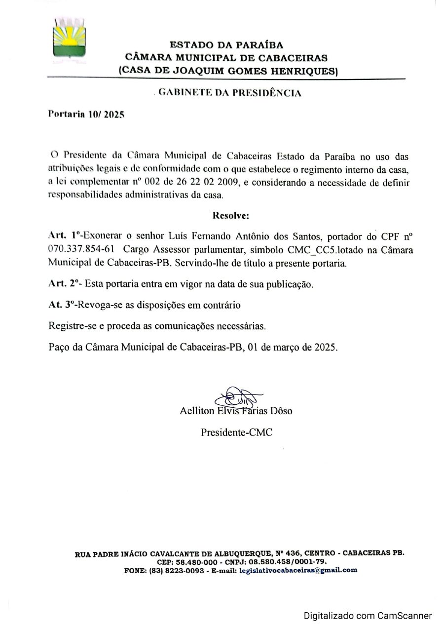 PORTARIA N° 0010/2025 - EXONERAÇÃO DE LUÍS FERNANDO ABTÔNIO DOS SANTOS