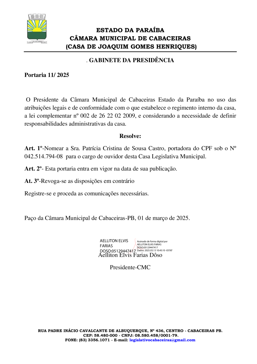 PORTARIA N° 0011/2025 - NOMEAÇÃO DE PATRÍCIA CRISTINA DE SOUSA CASTRO