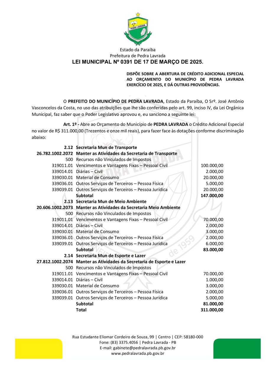 LEI N° 0391/2025 - DISPÕE SOBRE A ABERTURA DE CRÉDITO ADICIONAL ESPECIAL AO ORÇAMENTO DO MUNICÍPIO