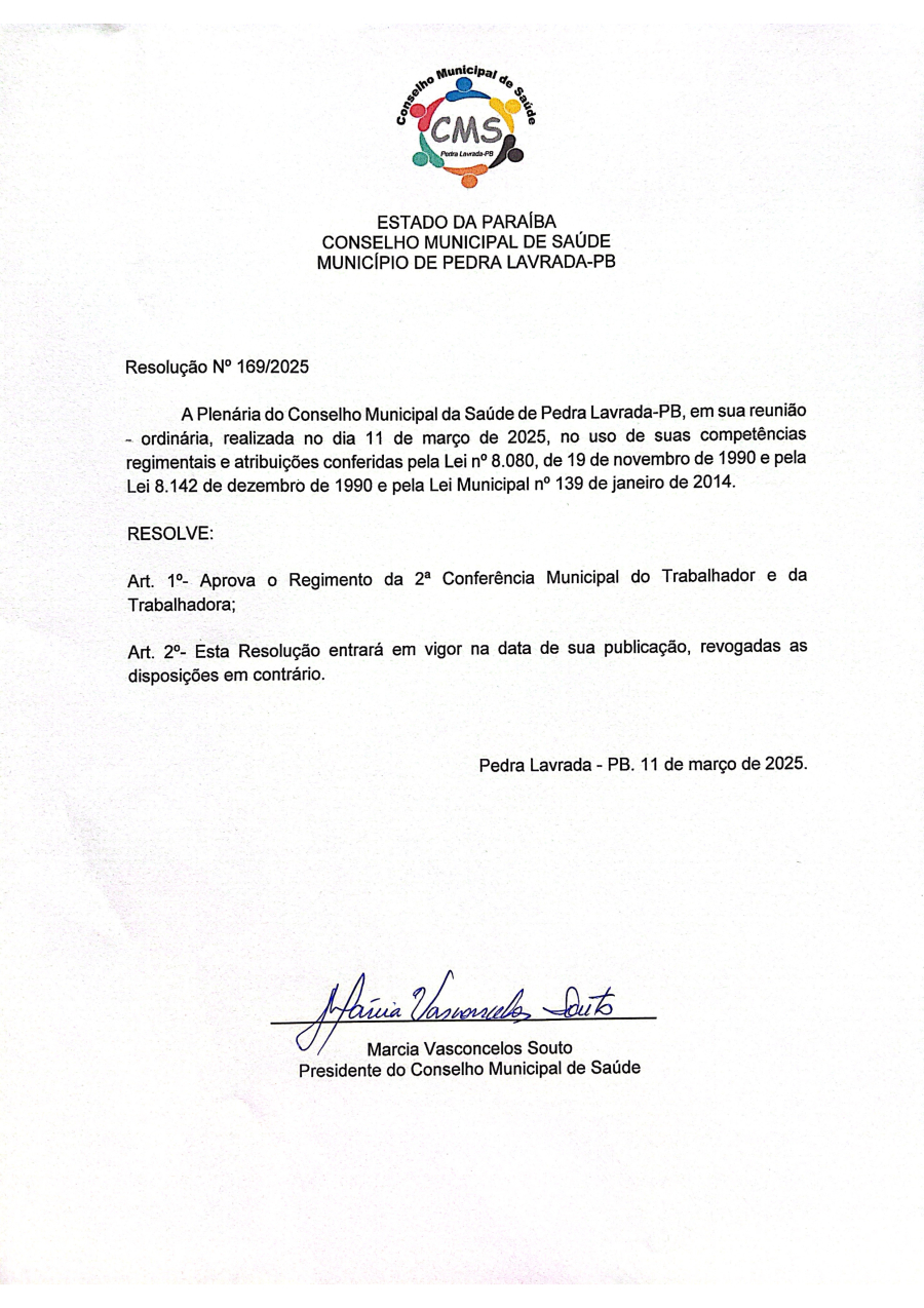 RESOLUÇÃO N° 0169/2025 - APROVA REGIMENTO DA 2ª CONFERÊNCIA DO TRABALHADOR E DA TRABALHADORA