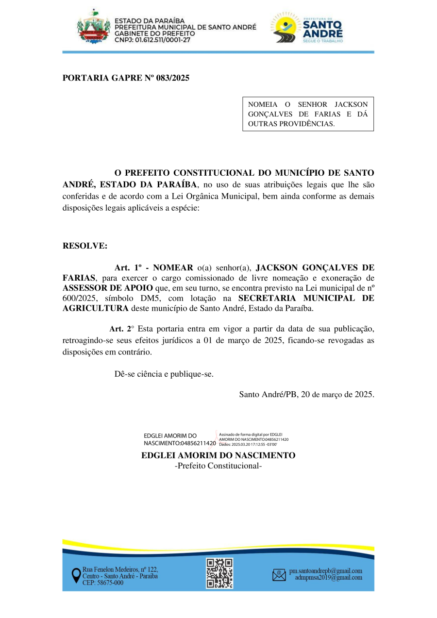 PORTARIA GAPRE Nº 083/2025 - NOMEIA O SENHOR JACKSON GONÇALVES DE FARIAS E DÁ OUTRAS PROVIDÊNCIAS.