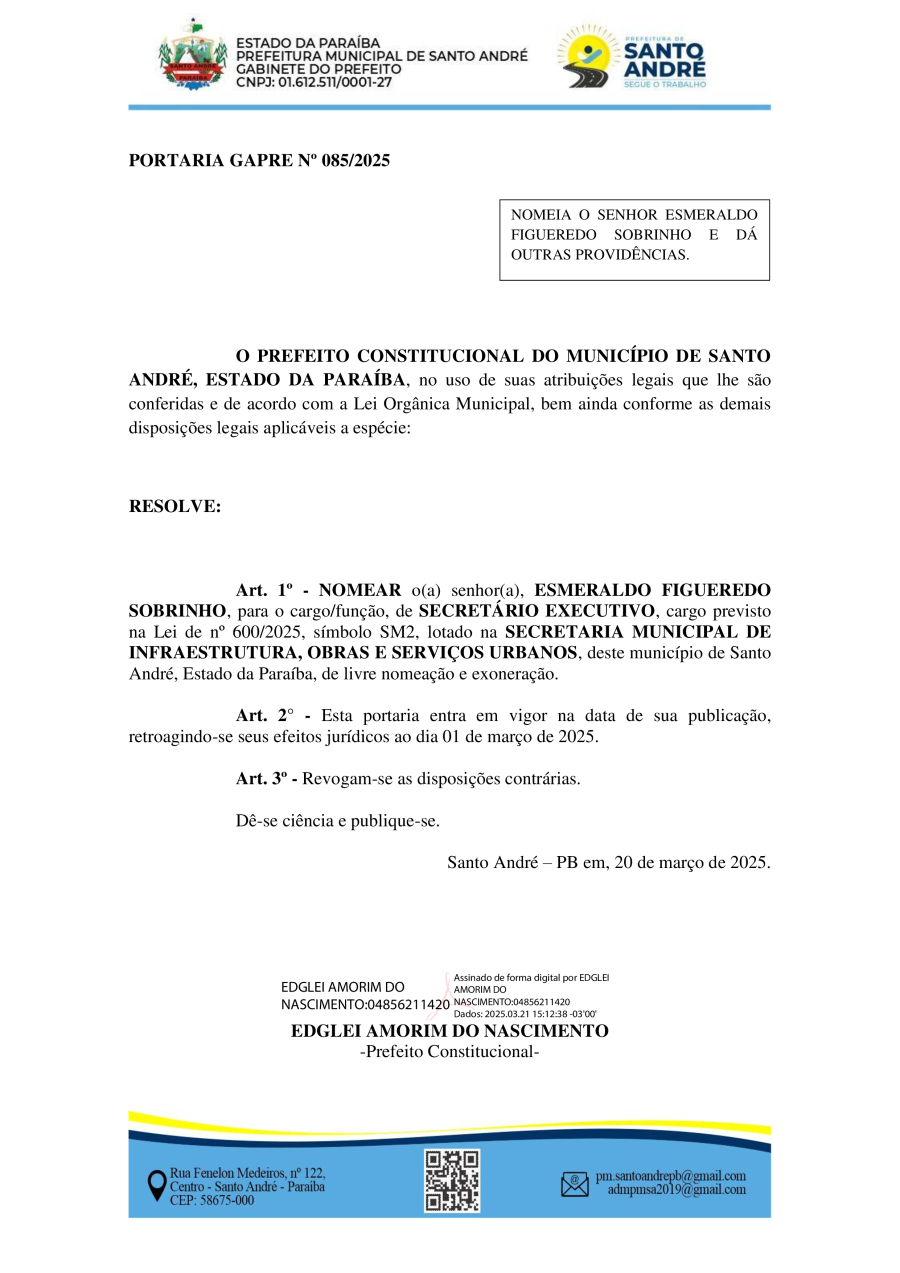 PORTARIA GAPRE Nº 085/2025 - NOMEIA O SENHOR ESMERALDO FIGUEREDO SOBRINHO E DÁ OUTRAS PROVIDÊNCIAS