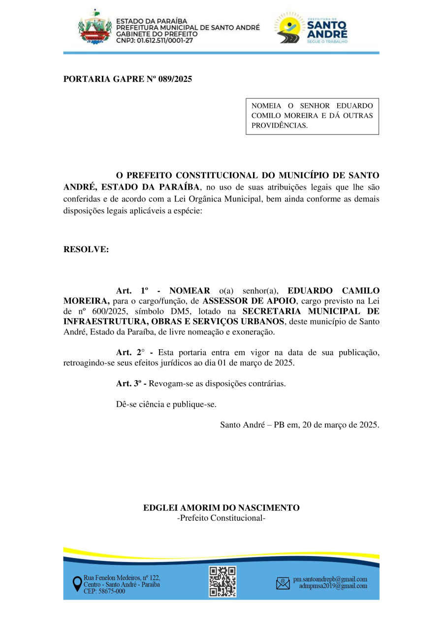 PORTARIA GAPRE Nº 089/2025 - NOMEIA O SENHOR EDUARDO CAMILO MOREIRA E DÁ OUTRAS PROVIDÊNCIAS