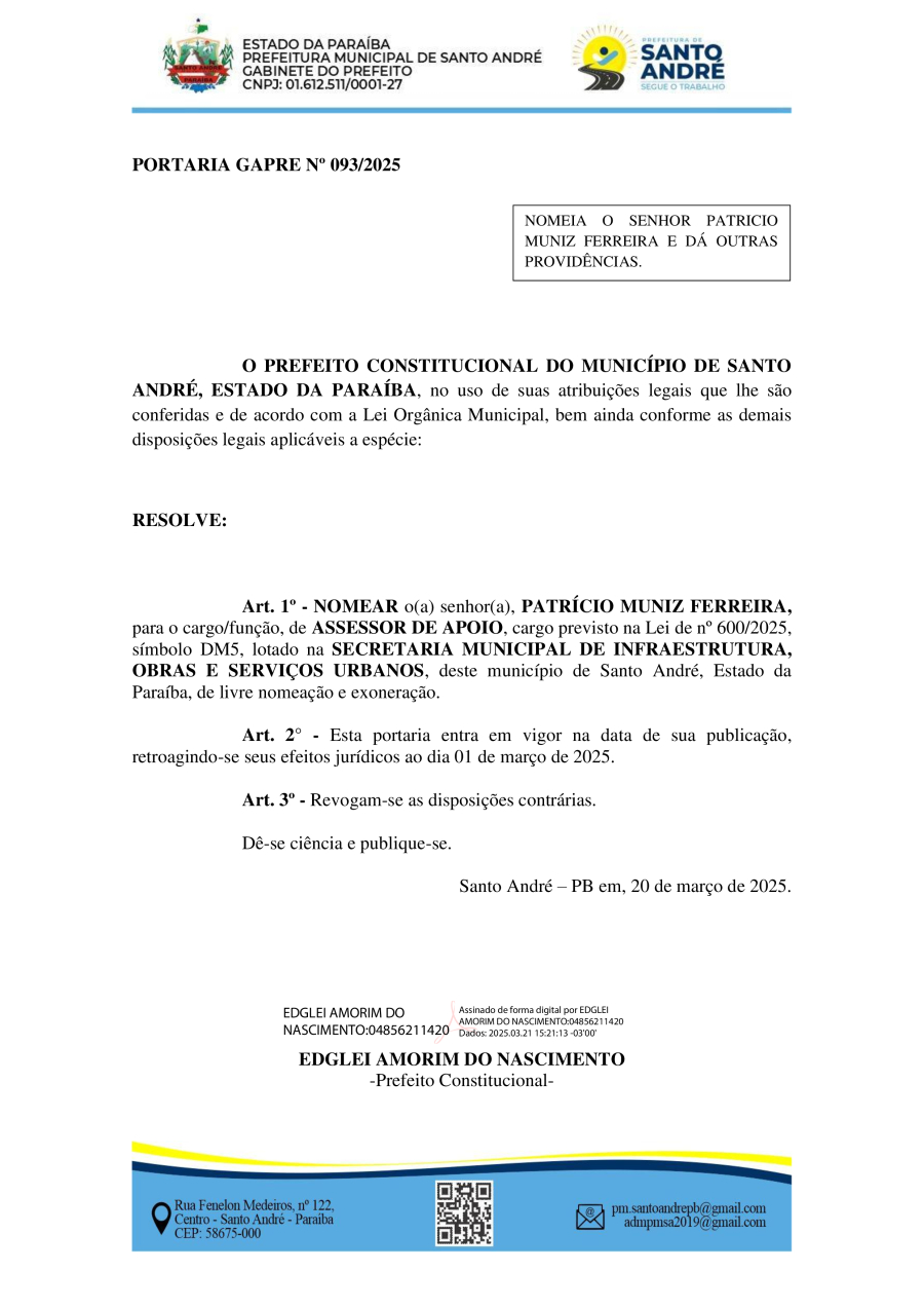 PORTARIA GAPRE Nº 093/2025 - NOMEIA O SENHOR PATRICIO MUNIZ FERREIRA E DÁ OUTRAS PROVIDÊNCIAS.