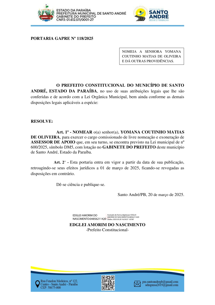 PORTARIA GAPRE Nº 118/2025 - NOMEIA A SENHORA YOMANA COUTINHO MATIAS DE OLIVEIRA E DÁ OUTRAS PROVIDÊNCIAS