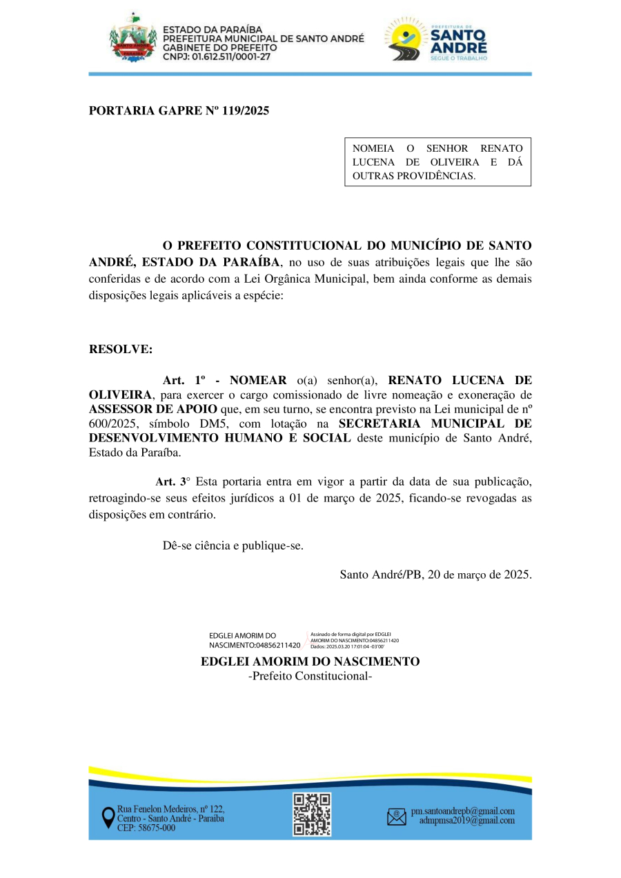 PORTARIA GAPRE Nº 119/2025 - NOMEIA O SENHOR RENATO LUCENA DE OLIVEIRA E DÁ OUTRAS PROVIDÊNCIAS