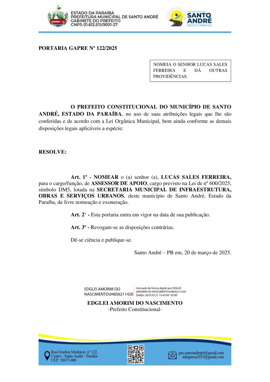 PORTARIA GAPRE Nº 122/2025 - NOMEIA O SENHOR LUCAS SALES FERREIRA E DÁ OUTRAS PROVIDÊNCIAS