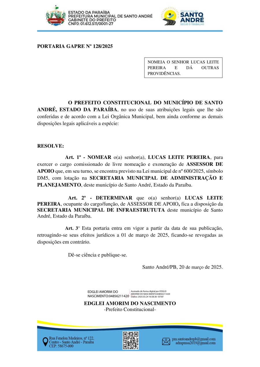 PORTARIA GAPRE Nº 128/2025 - NOMEIA O SENHOR LUCAS LEITE PEREIRA E DÁ OUTRAS PROVIDÊNCIAS