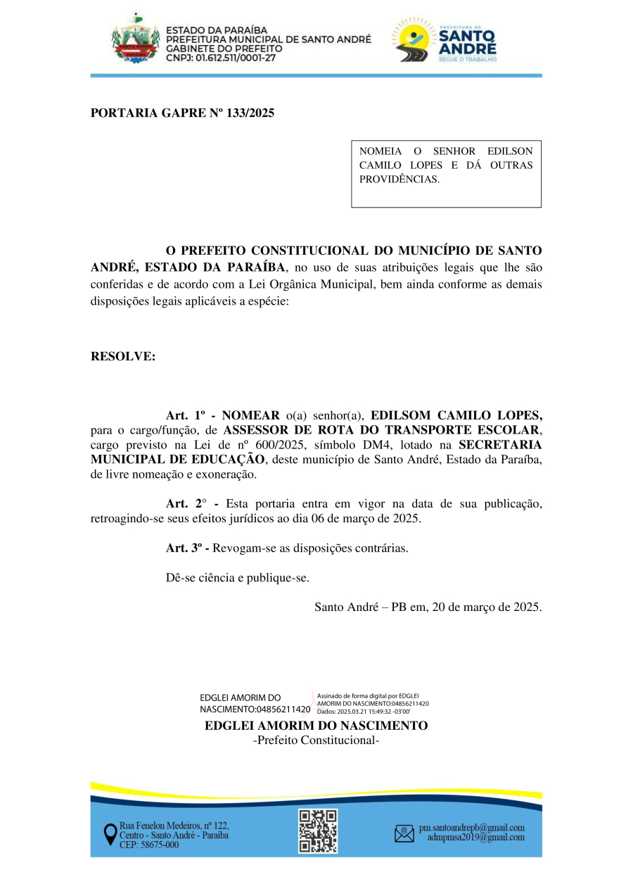 PORTARIA GAPRE Nº 133/2025 - NOMEIA O SENHOR EDILSON CAMILO LOPES E DÁ OUTRAS PROVIDÊNCIAS