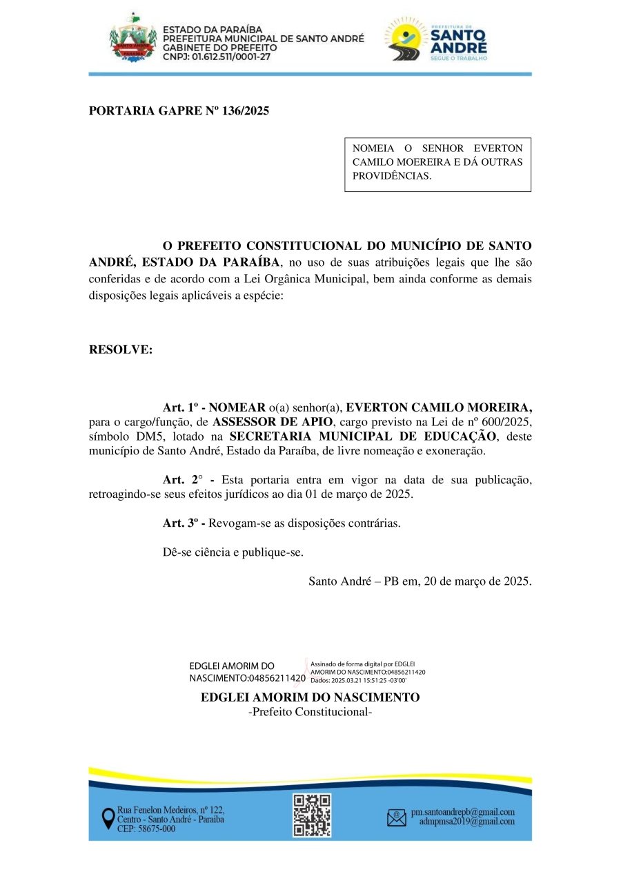 PORTARIA GAPRE Nº 136/2025 - NOMEIA O SENHOR EVERTON CAMILO MOEREIRA E DÁ OUTRAS PROVIDÊNCIAS
