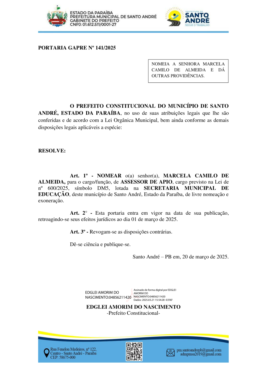 PORTARIA GAPRE Nº 141/2025 - NOMEIA A SENHORA MARCELA CAMILO DE ALMEIDA E DÁ OUTRAS PROVIDÊNCIAS