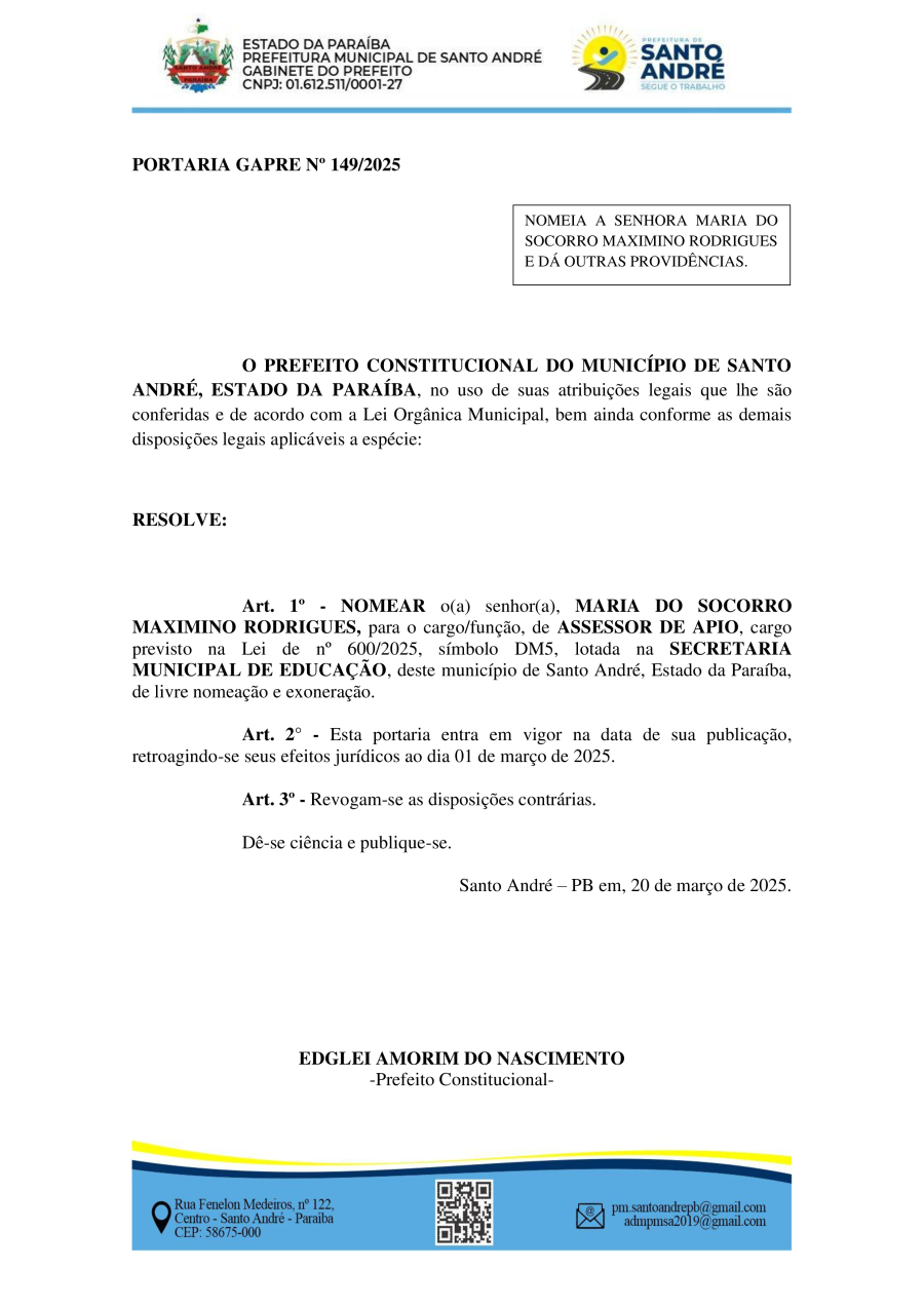 PORTARIA GAPRE Nº 149/2025 - NOMEIA A SENHORA MARIA DO SOCORRO MAXIMINO RODRIGUES E DÁ OUTRAS PROVIDÊNCIAS