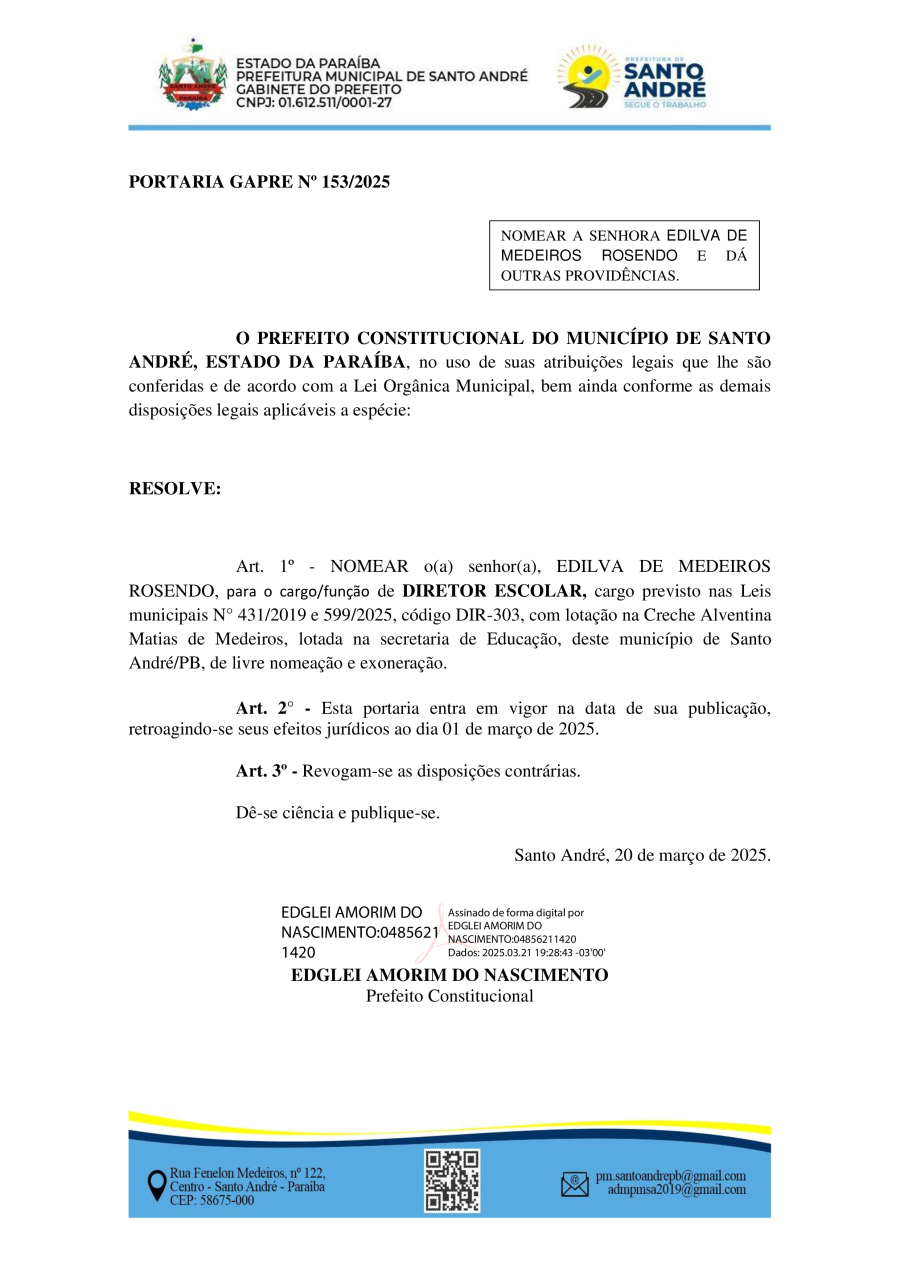 PORTARIA GAPRE Nº 153/2025 - NOMEAR A SENHORA EDILVA DE MEDEIROS ROSENDO E DÁ OUTRAS PROVIDÊNCIAS