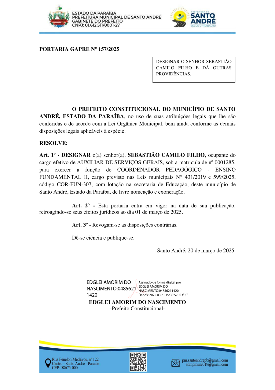 PORTARIA GAPRE Nº 157/2025 - DESIGNAR O SENHOR SEBASTIÃO CAMILO FILHO E DÁ OUTRAS PROVIDÊNCIAS