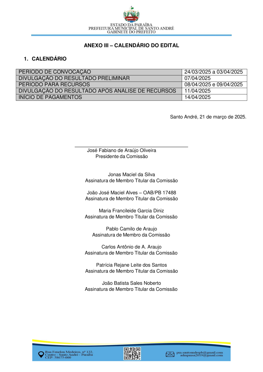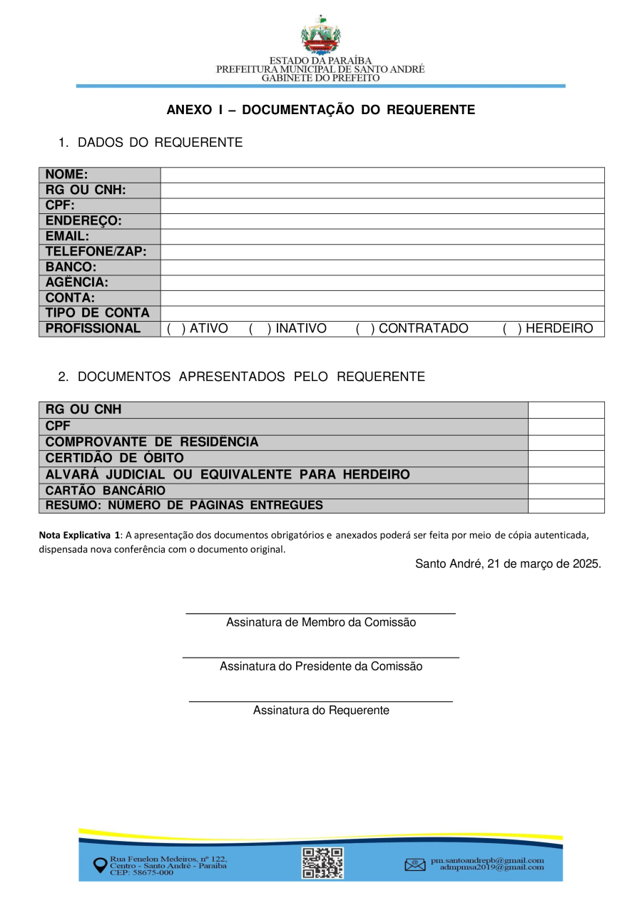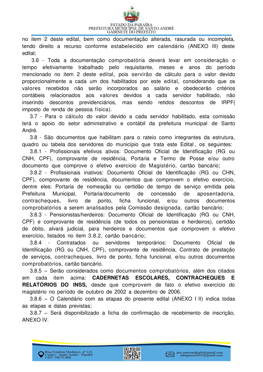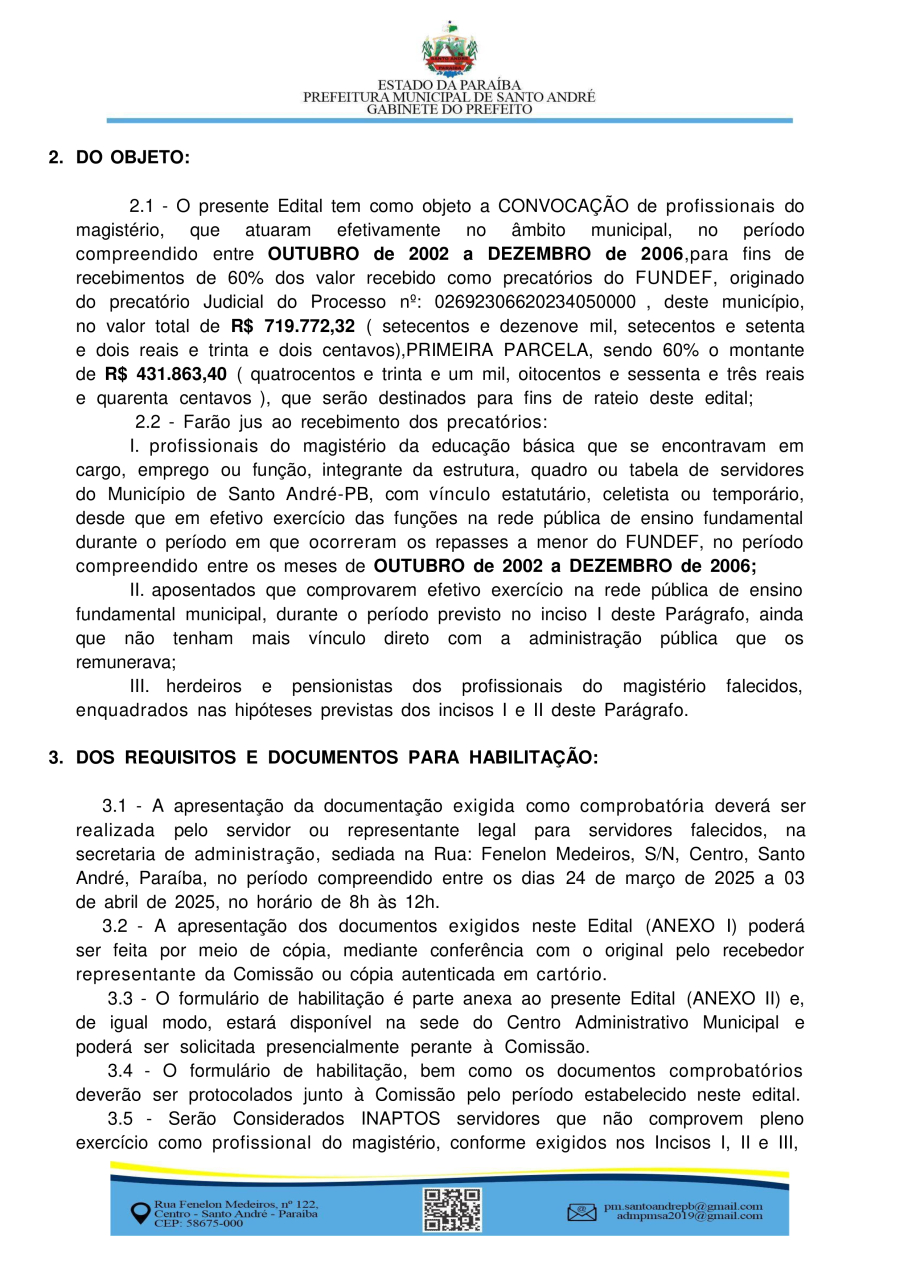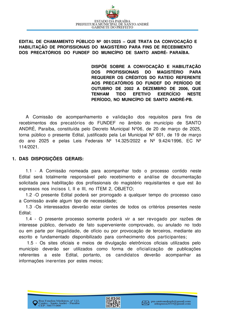 EDITAL DE CHAMAMENTO PÚBLICO Nº 001/2025 – QUE TRATA DA CONVOCAÇÃO E HABILITAÇÃO DE PROFISSIONAIS DO MAGISTÉRIO PARA FINS DE RECEBIMENTO DOS PRECATÓRIOS DO FUNDEF DO MUNICÍPIO DE SANTO ANDRÉ- PARAÍBA -