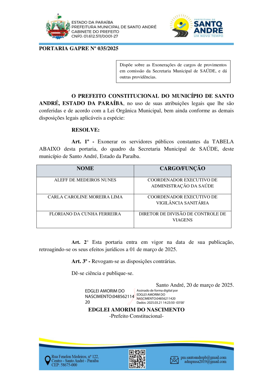 PORTARIA GAPRE Nº 035/2025 - DISPÕE SOBRE AS EXONERAÇÕES DE CARGOS DE PROVIMENTOS EM COMISSÃO DA SECRETARIA MUNICIPAL DE SAÚDE, E DÁ OUTRAS PROVIDÊNCIAS.