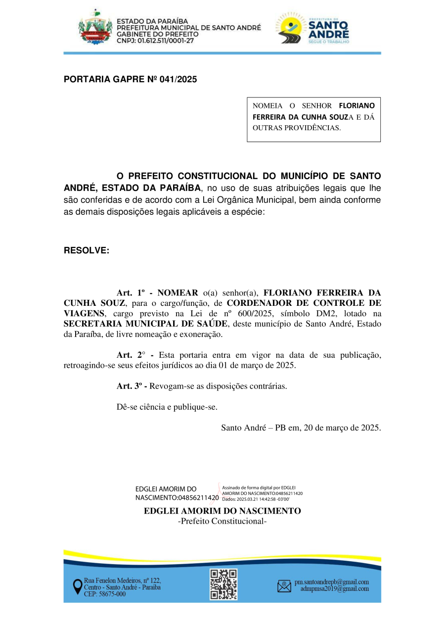 PORTARIA GAPRE Nº 041/2025 - NOMEIA O SENHOR FLORIANO FERREIRA DA CUNHA SOUZA E DÁ OUTRAS PROVIDÊNCIAS