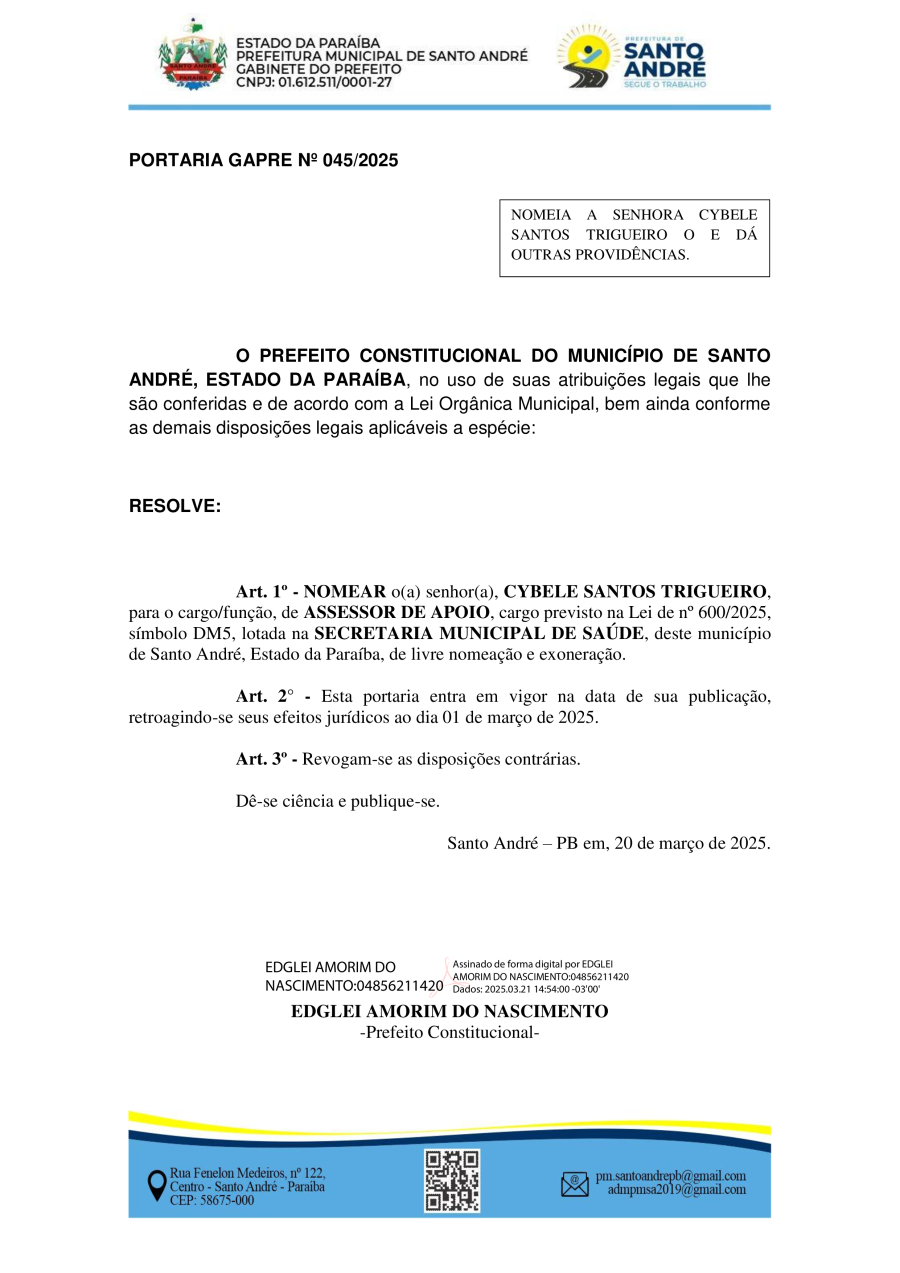 PORTARIA GAPRE Nº 045/2025 - NOMEIA A SENHORA CYBELE SANTOS TRIGUEIRO O E DÁ OUTRAS PROVIDÊNCIAS.