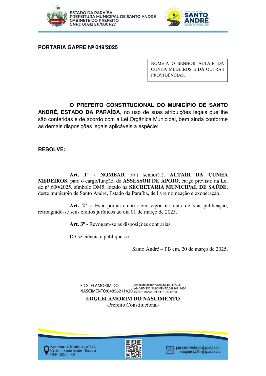 PORTARIA GAPRE Nº 049/2025 - NOMEIA O SENHOR ALTAIR DA CUNHA MEDEIROS E DÁ OUTRAS PROVIDÊNCIAS