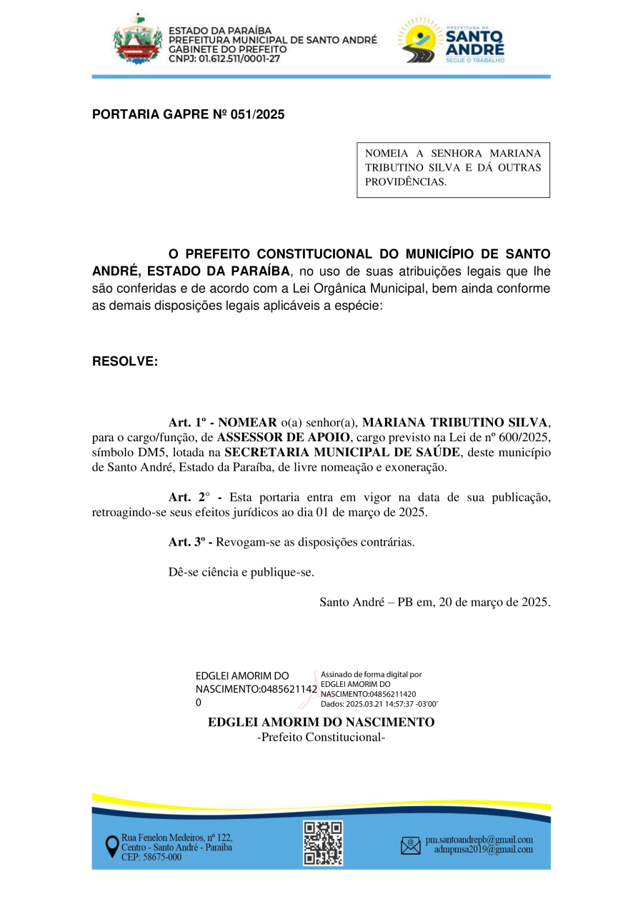 PORTARIA GAPRE Nº 051/2025 - NOMEIA A SENHORA MARIANA TRIBUTINO SILVA E DÁ OUTRAS PROVIDÊNCIAS