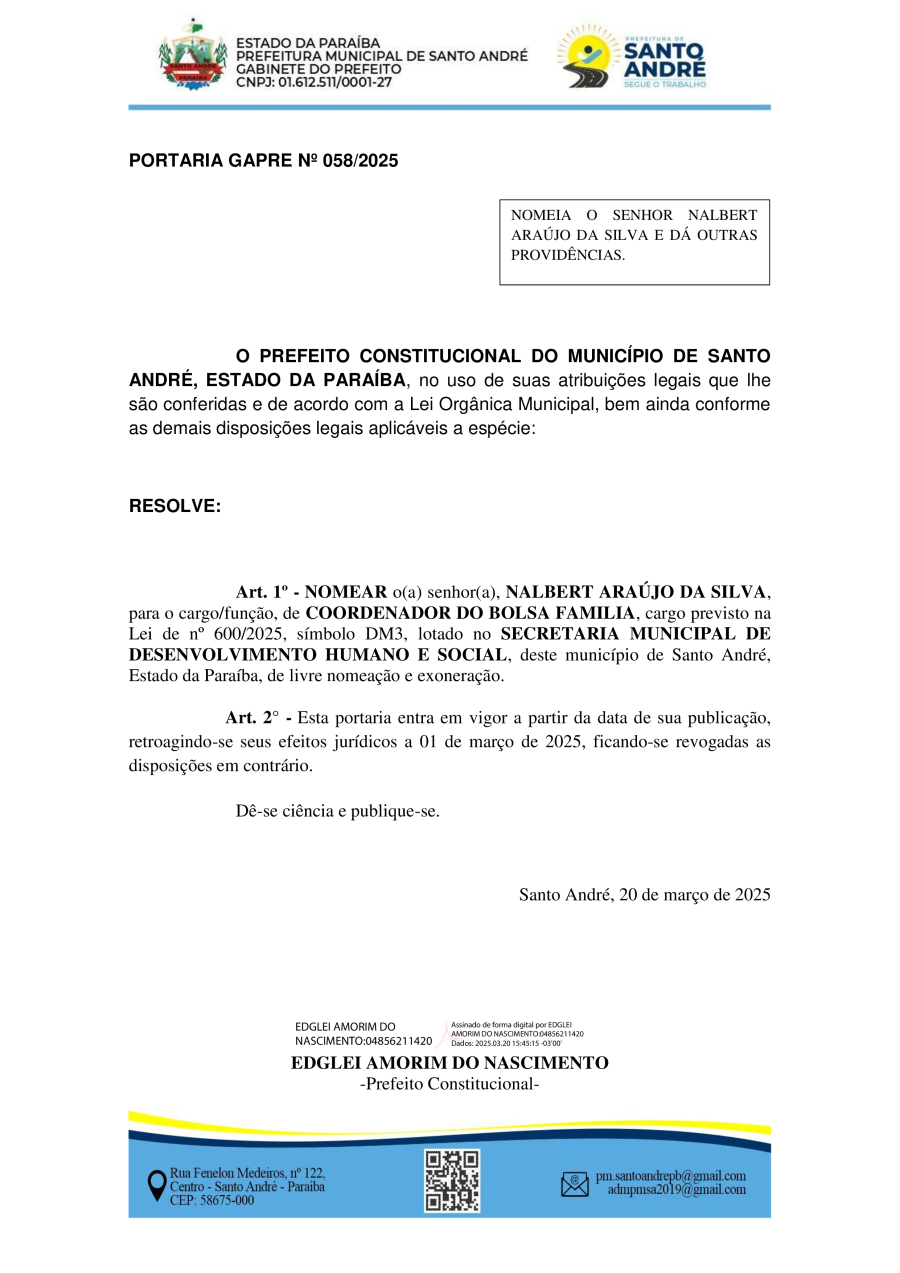 PORTARIA GAPRE Nº 058/2025 - NOMEIA O SENHOR NALBERT ARAÚJO DA SILVA E DÁ OUTRAS PROVIDÊNCIAS