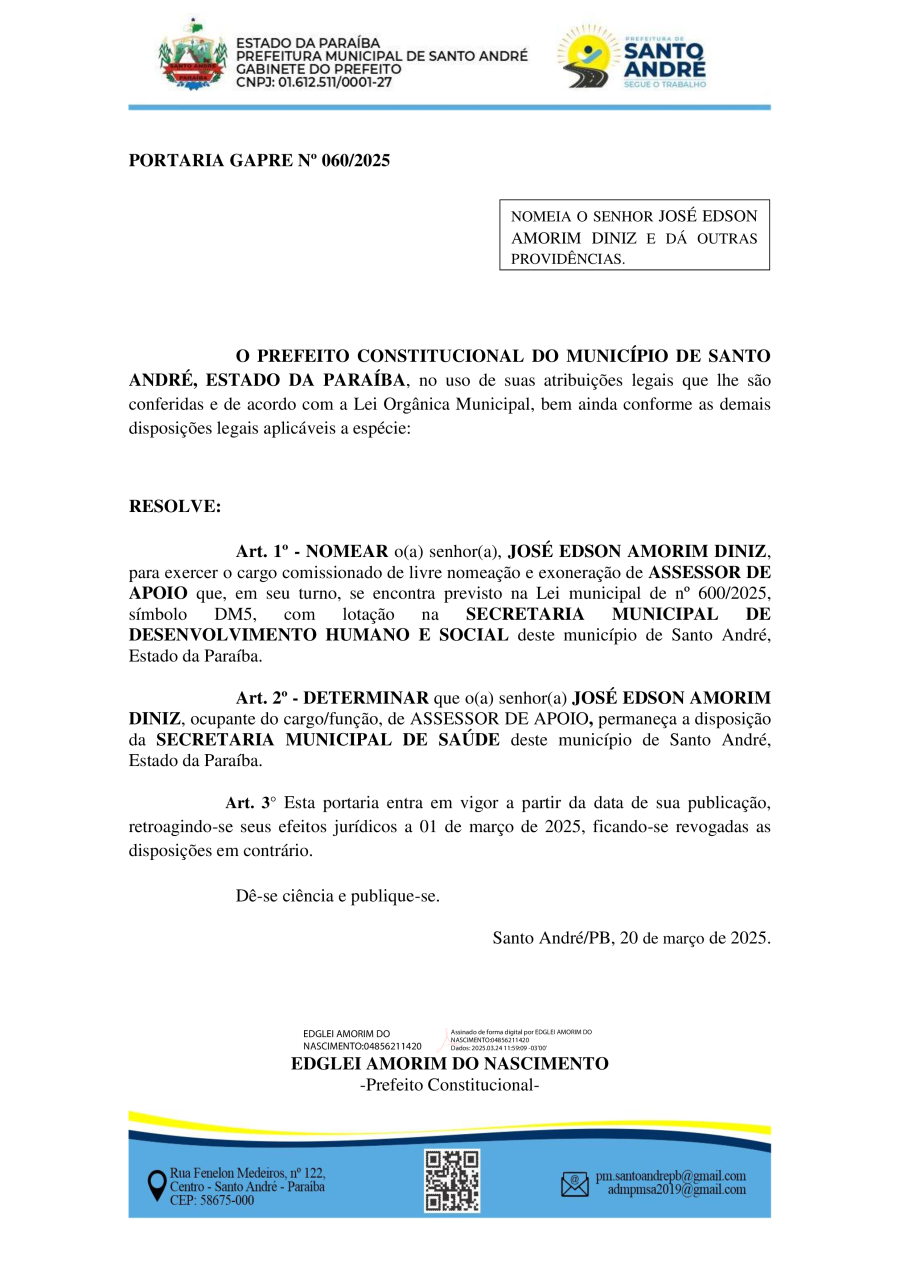 PORTARIA GAPRE Nº 060/2025 - NOMEIA O SENHOR JOSÉ EDSON AMORIM DINIZ E DÁ OUTRAS PROVIDÊNCIAS