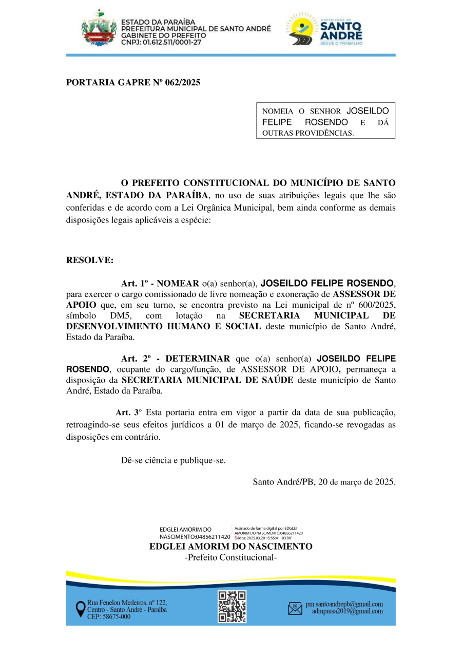 PORTARIA GAPRE Nº 062/2025 - NOMEIA O SENHOR JOSEILDO FELIPE ROSENDO E DÁ OUTRAS PROVIDÊNCIAS.