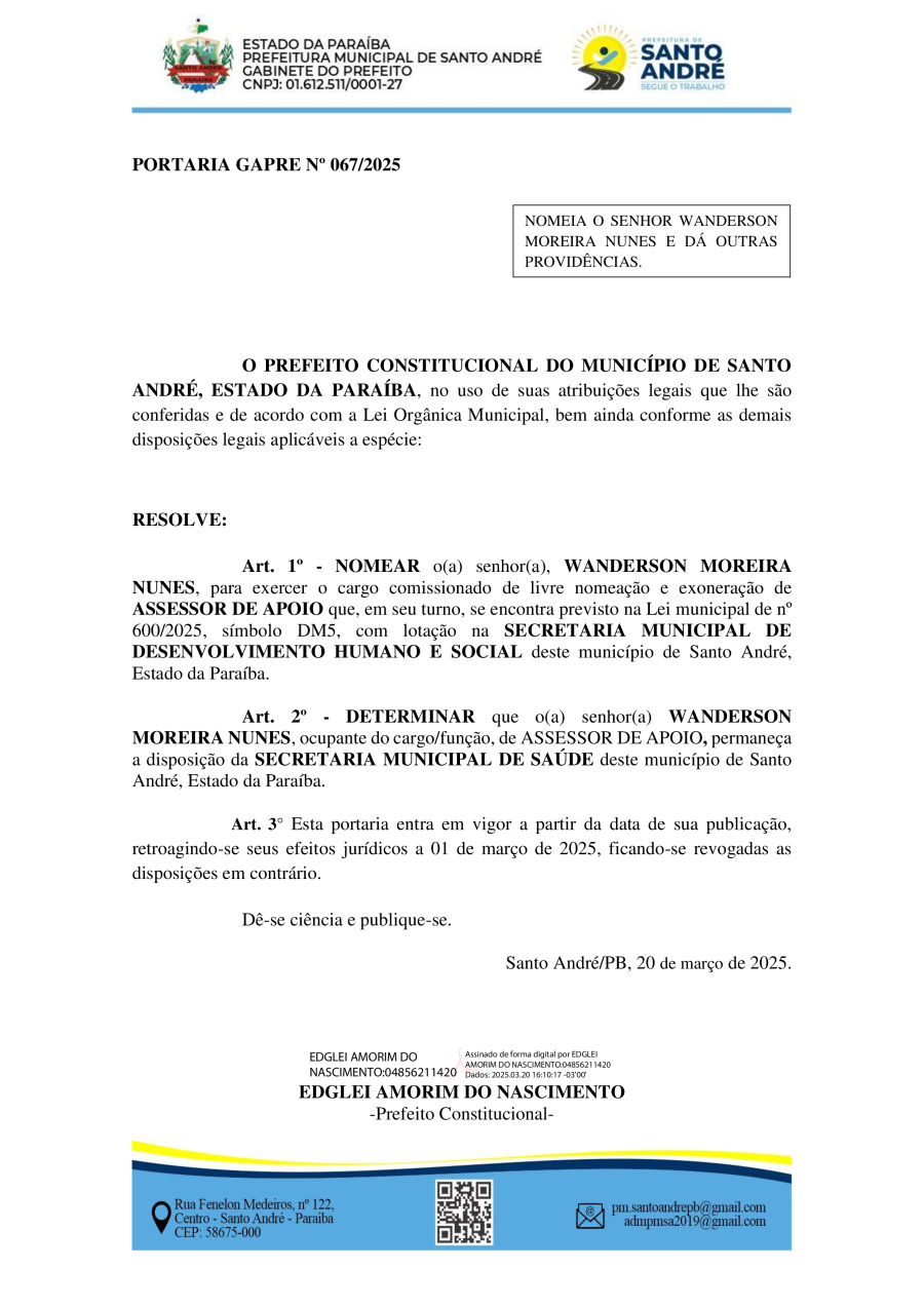 PORTARIA GAPRE Nº 067/2025 - NOMEIA O SENHOR WANDERSON MOREIRA NUNES E DÁ OUTRAS PROVIDÊNCIAS