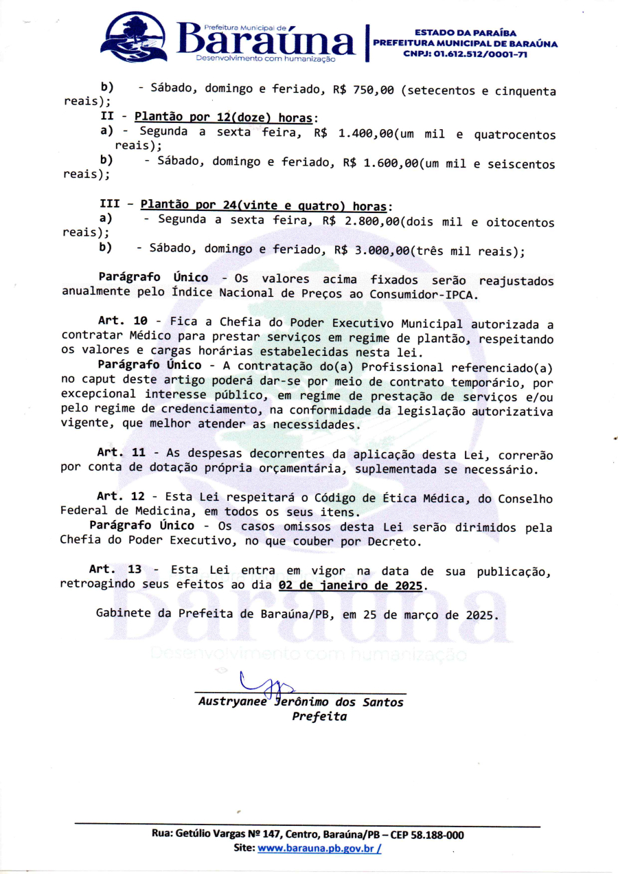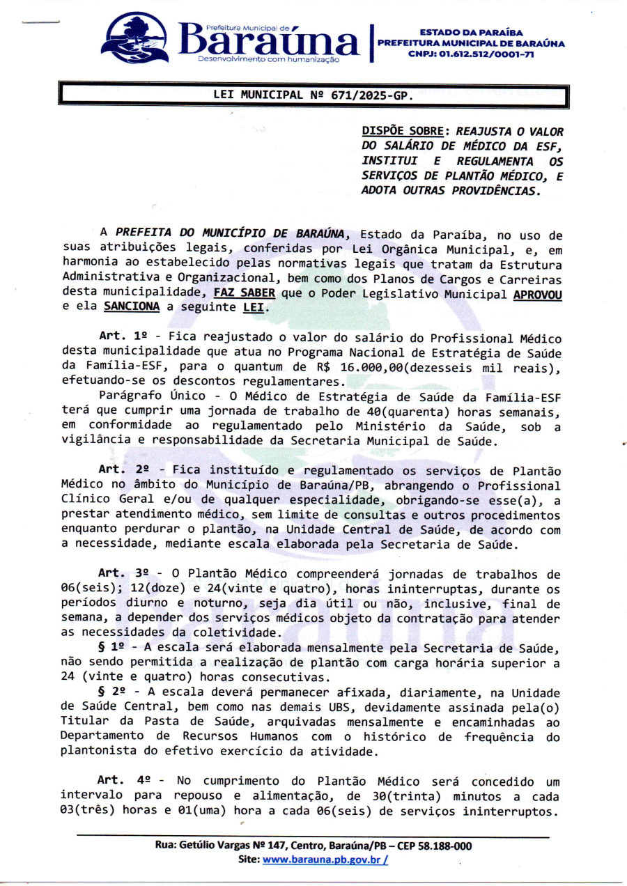 LEI MUNICIPAL Nº 671/2025-GP - DISPÕE SOBRE: REAJUSTA O VALOR DO SALARIO DE MÉDICO DA ESF, INSTITUI E REGULAMENTA OS SERVIÇOS DE PLANTÃO MÉDICO, E ADOTA OUTRAS PROVIDÊNCIAS. - 26 DE MARÇO DE 2025.