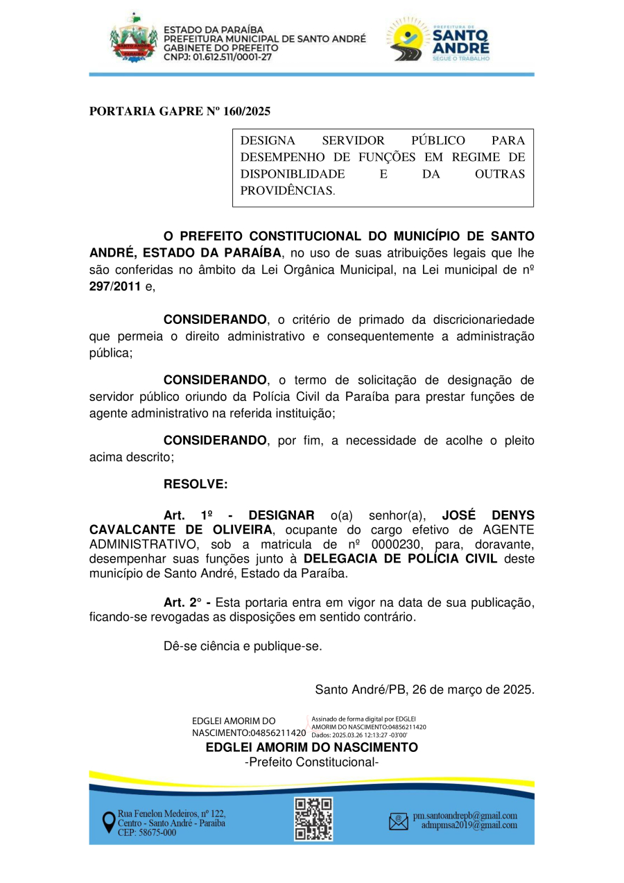 PORTARIA GAPRE Nº 160/2025 - DESIGNA SERVIDOR PÚBLICO PARA DESEMPENHO DE FUNÇÕES EM REGIME DE DISPONIBLIDADE E DA OUTRAS PROVIDÊNCIAS.