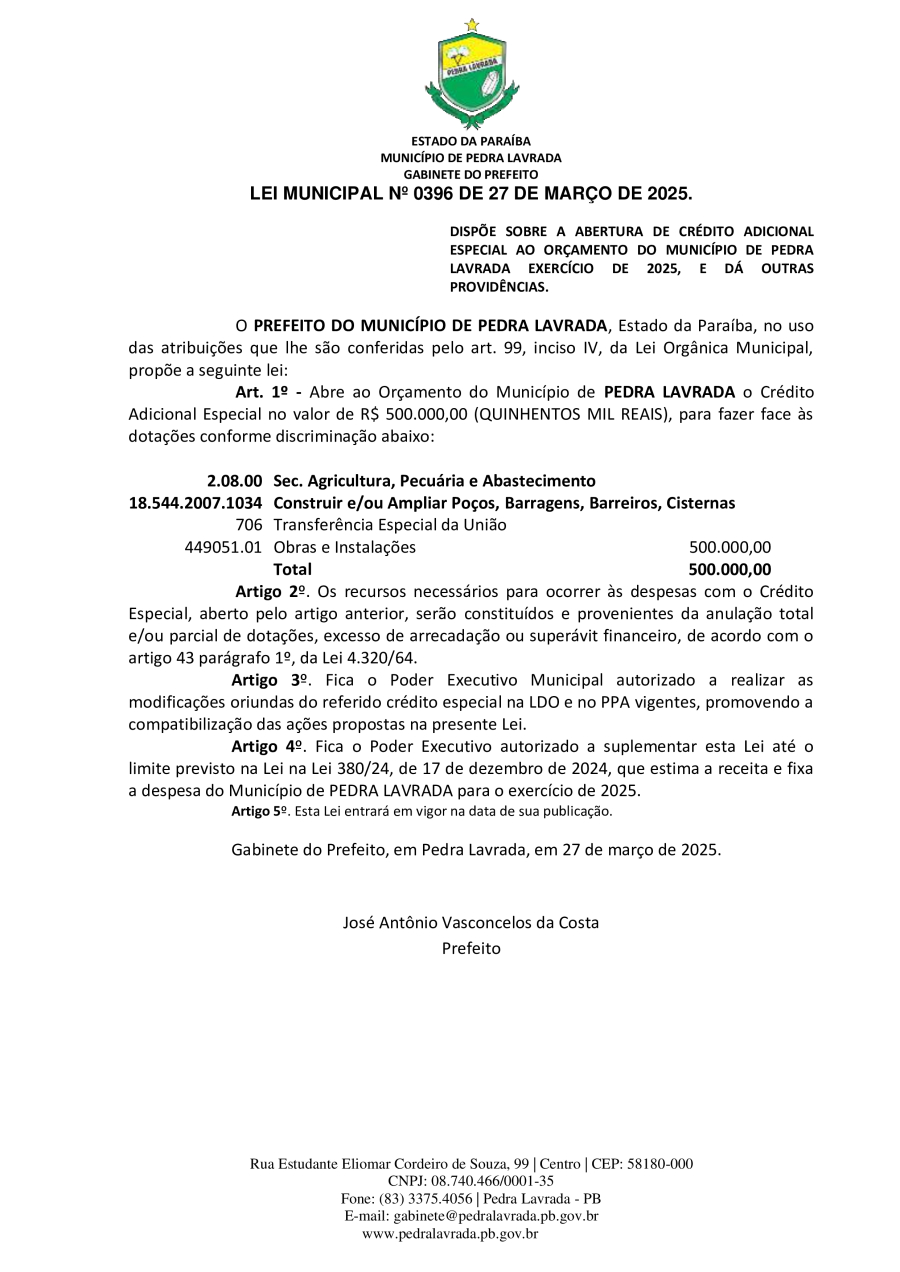 LEI N° 0396/2025 - DISPÕE SOBRE A ABERTURA DE CRÉDITO ADICIONAL ESPECIAL AO ORÇAMENTO DO MUNICÍPIO