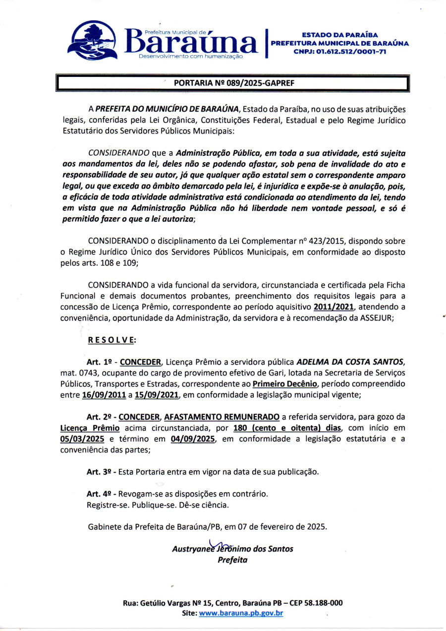 PORTARIA Nº 089/2025-GP - CONCEDER LICENÇA PREMIO A SERVIDORA ADELMA DA COSTA SANTOS. - 28 DE MARÇO DE 2025.