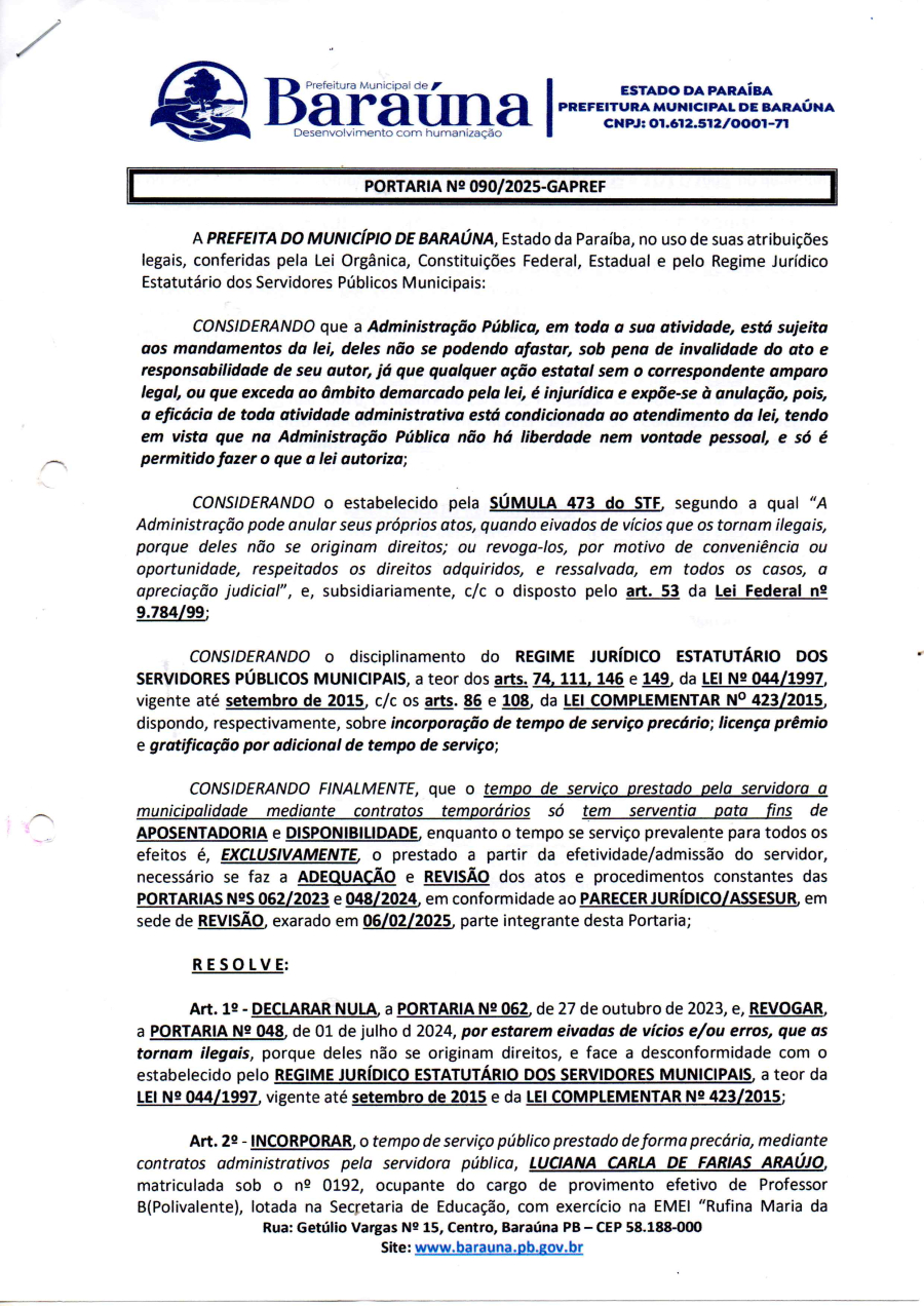 PORTARIA Nº 090/2025-GAPREF - CONCEDER LICENÇA PREMIO A SERVIDORA LUCIANA CARLA DE FARIAS ARAÚJO - 28 DE MARÇO DE 2025.
