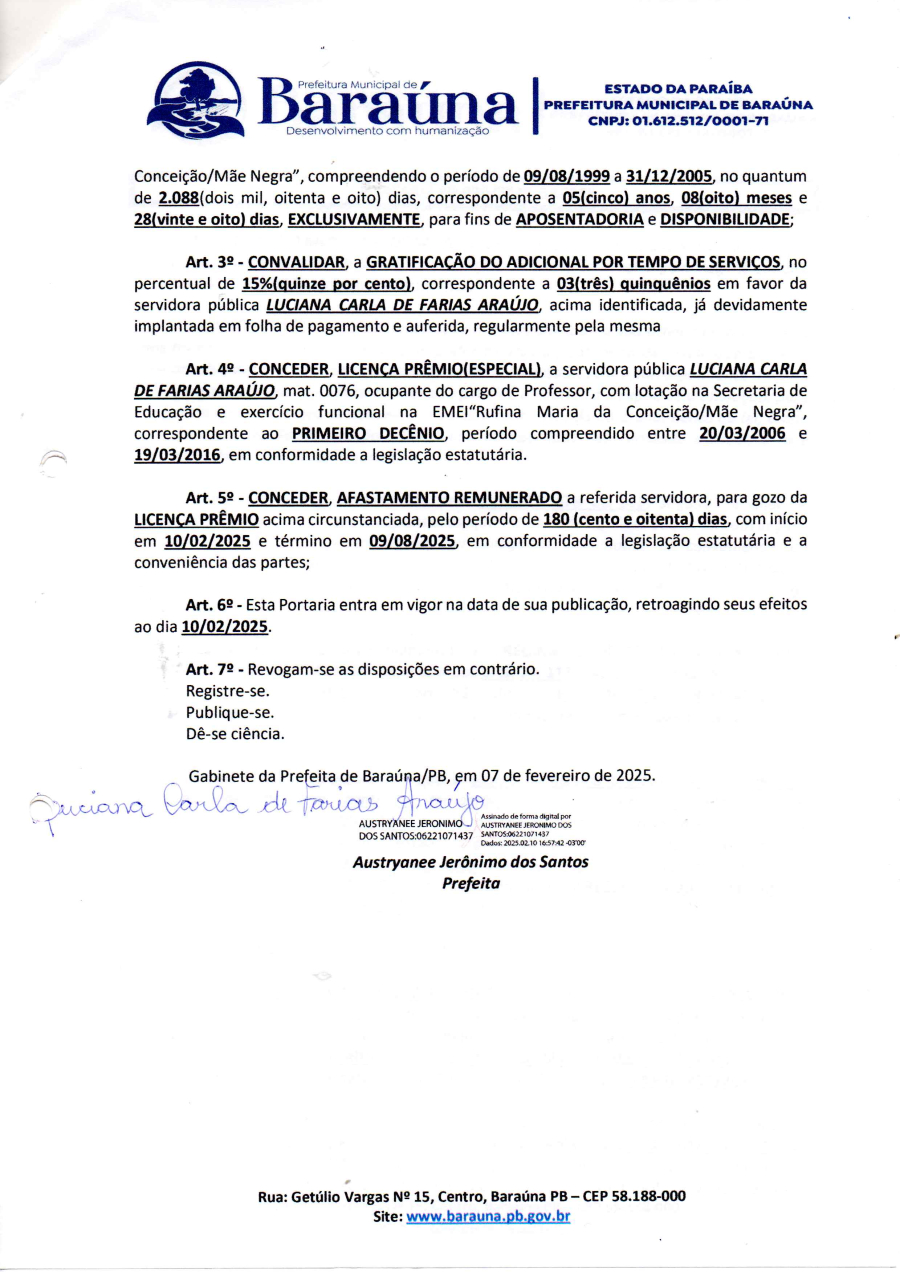 Conforme MP n° 2.200-2 de 24/08/2001, que institui a infraestrutura de chaves Públicas. Matéria Publicada no Diário Oficial do Município de Baraúna/PB no dia - Edição 01206.