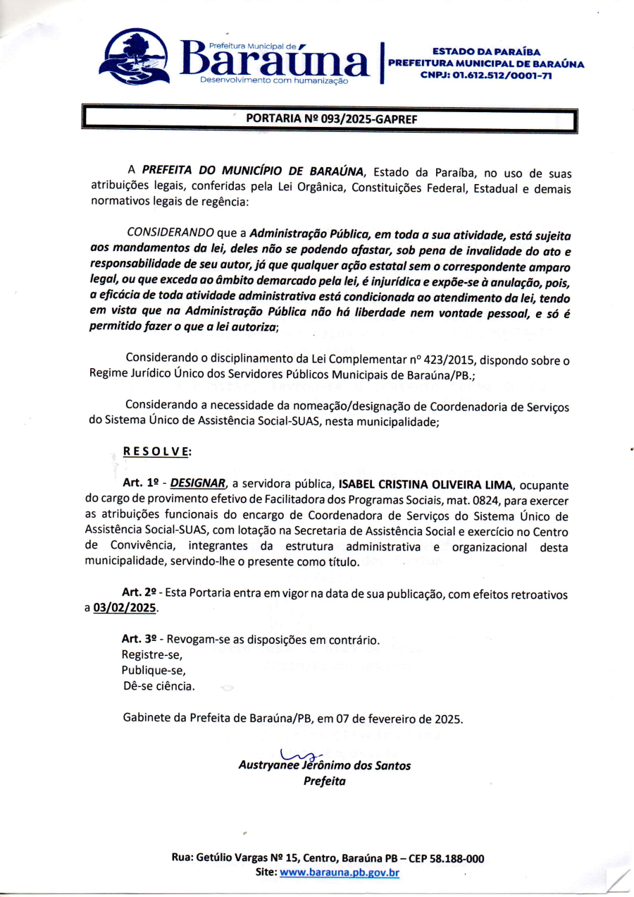 PORTARIA Nº 093/2025-GAPREF - DESIGNAR A SERVIDORA PÚBLICA ISABEL CRISTINA OLIVEIRA LIMA. - 28 DE MARÇO DE 2025.