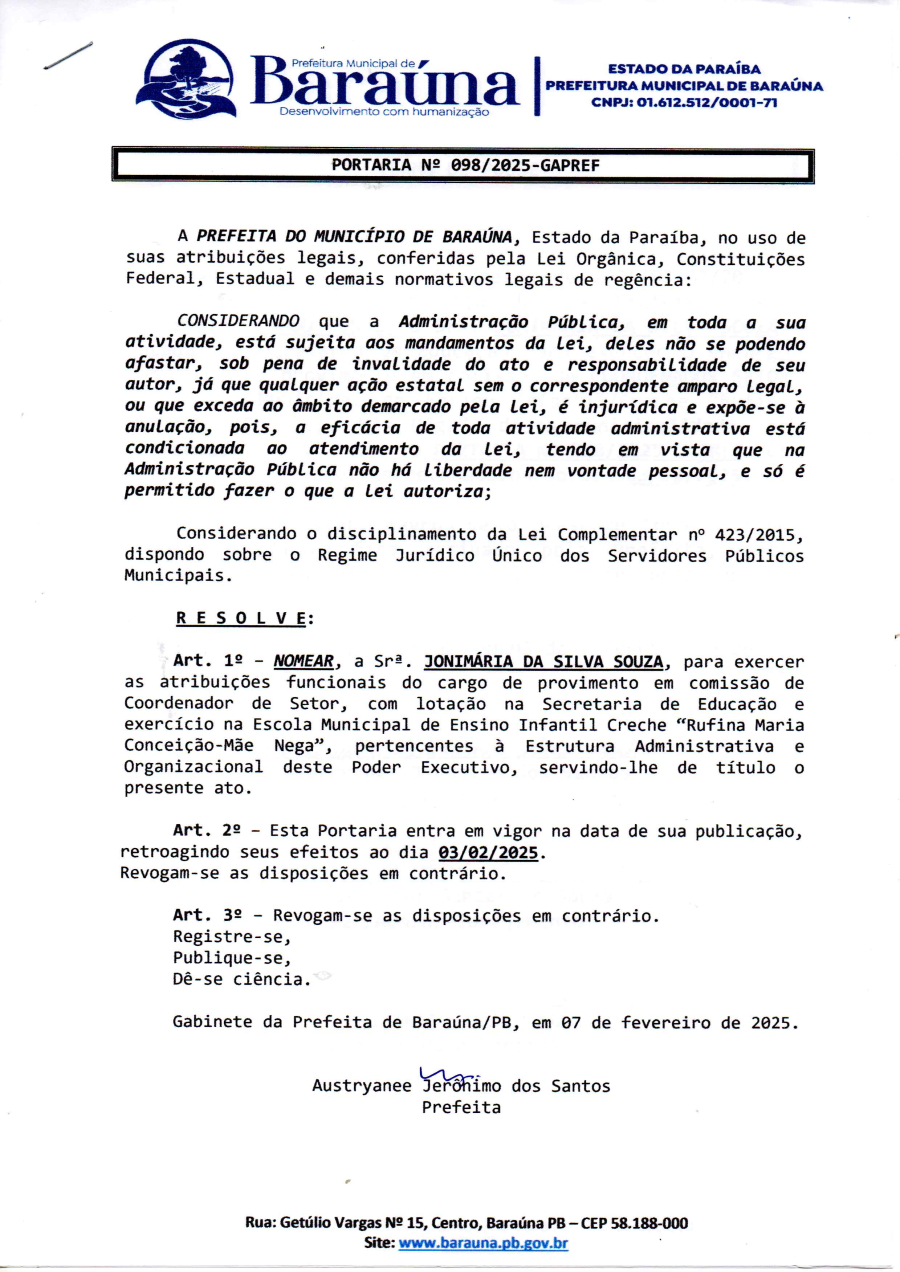 PORTARIA Nº 098/2025-GAPREF - NOMEAR JONIMÁRIA DA SILVA SOUZA. - 28 DE MARÇO DE 2025.