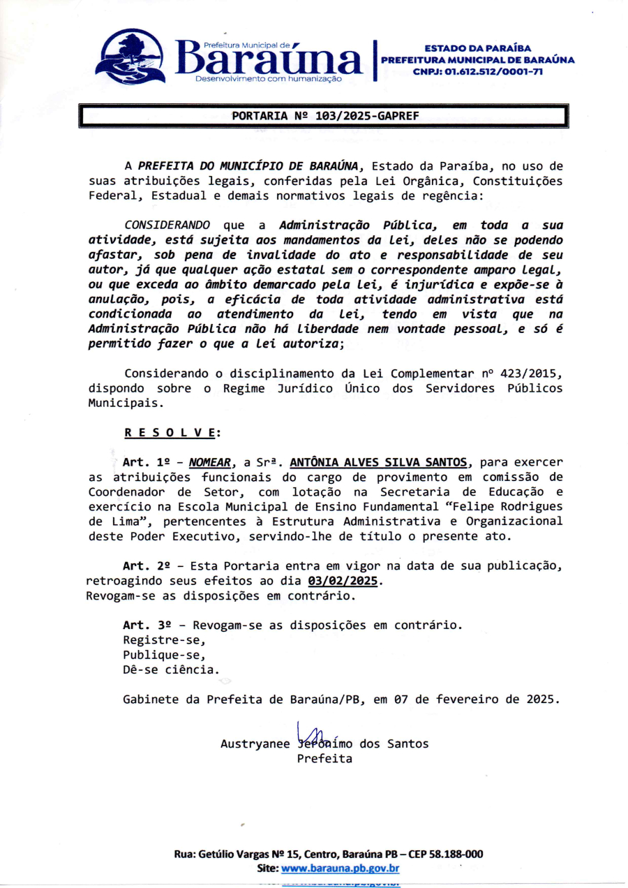 PORTARIA Nº 103/2025-GAPREF - NOMEAR ANTÔNIA ALVES SILVA SANTOS. - 28 DED MARÇO DE 2025.