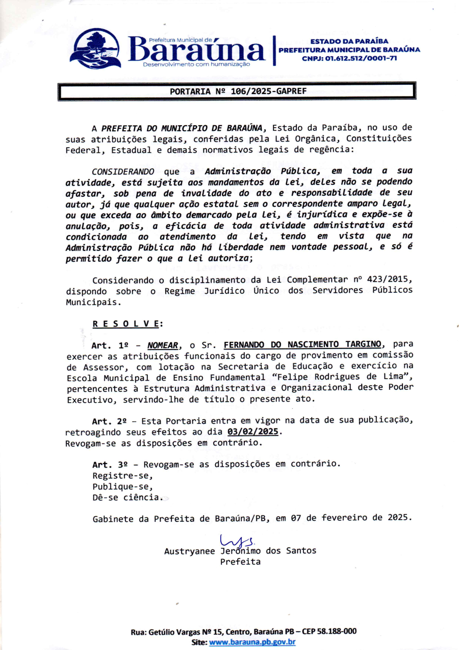 PORTARIA Nº 106/2025-GAPREF - NOMEAR FERNANDO DO NASCIMENTO TARGINO. - 28 DE MARÇO DE 2025.
