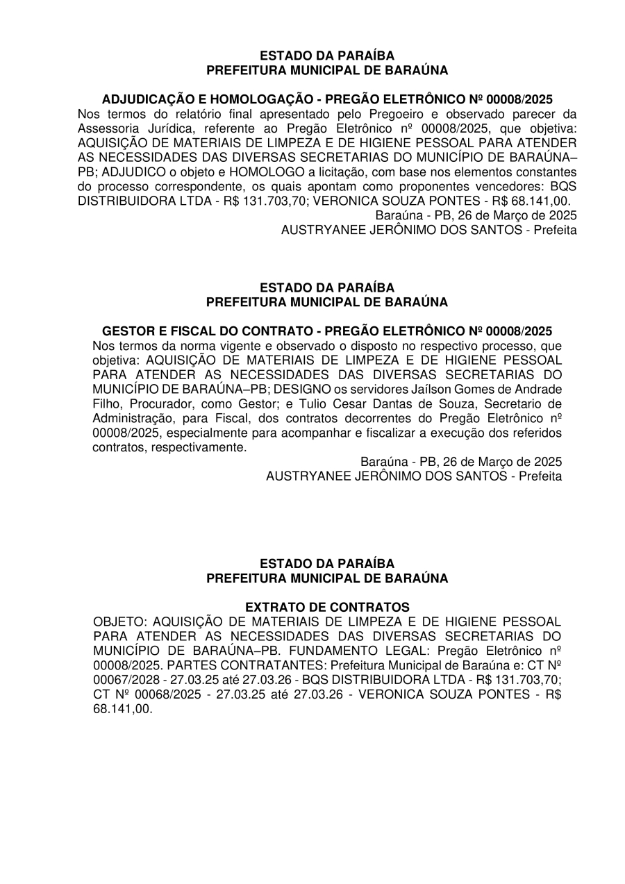Conforme MP n° 2.200-2 de 24/08/2001, que institui a infraestrutura de chaves Públicas. Matéria Publicada no Diário Oficial do Município de Baraúna/PB no dia - Edição 01207.