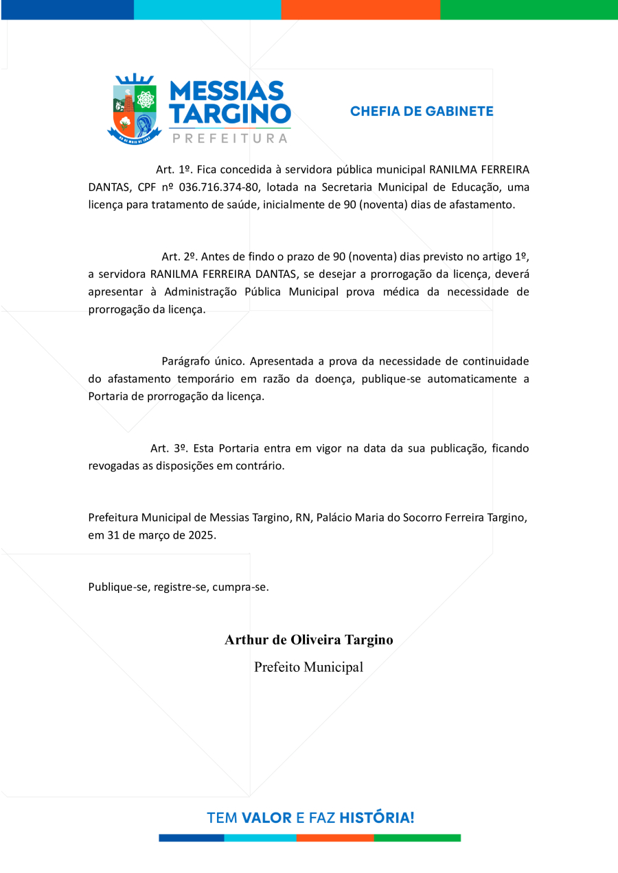 Conforme MP n° 2.200-2 de 24/08/2001, que institui a infraestrutura de chaves Públicas. Matéria Publicada no Diário Oficial do Município de Messias Targino/RN no dia - Edição 01257.